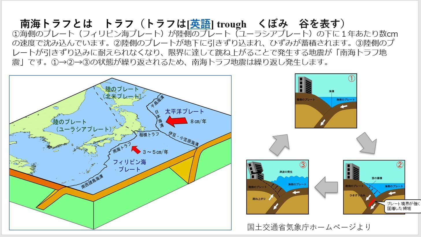 宮崎県で起こった地震から、南海トラフの前触れではないかと緊張が走っております。私も南海トラフの説明を気象庁のホームページをお借りして少しだけ説明しました。