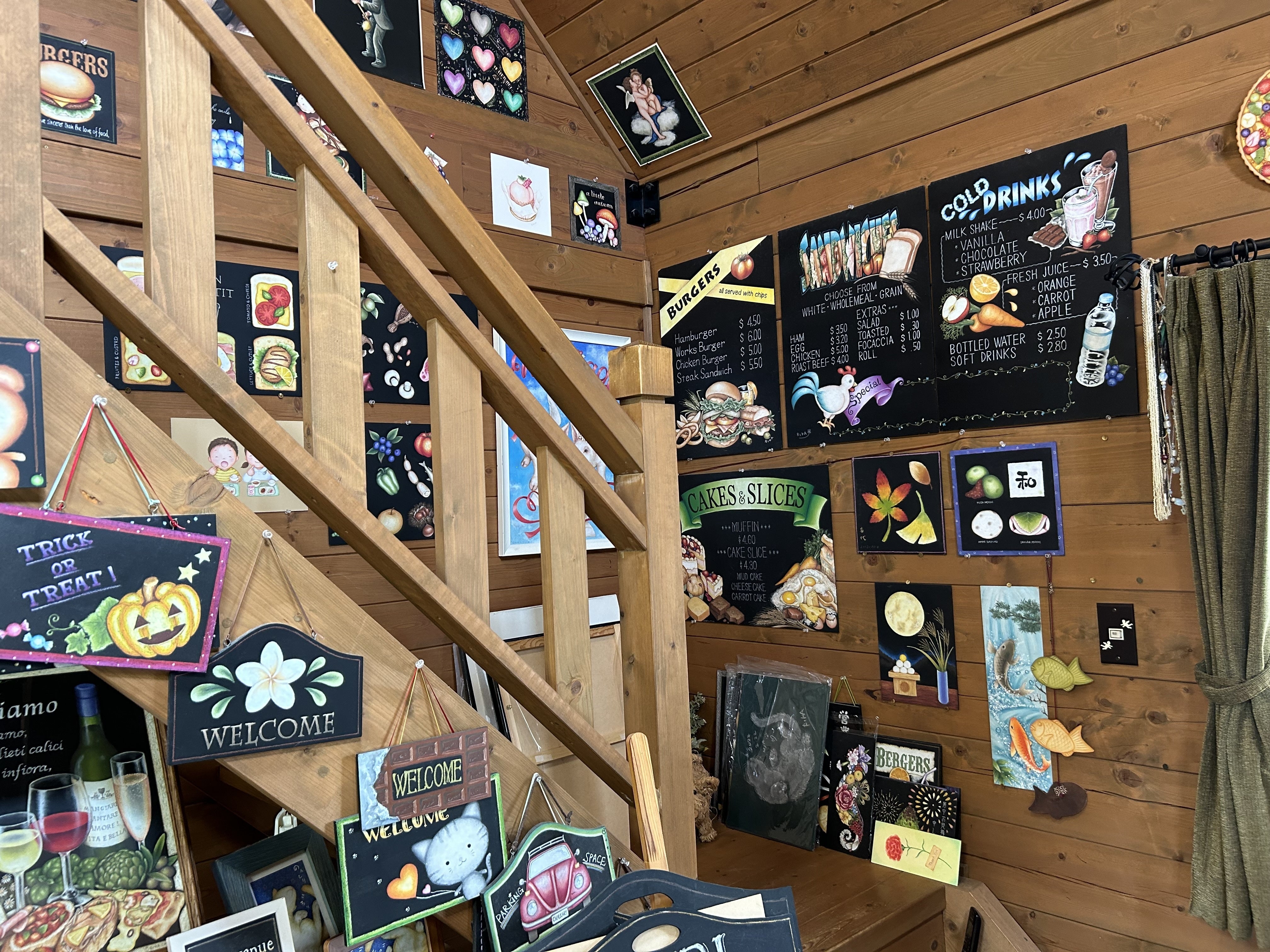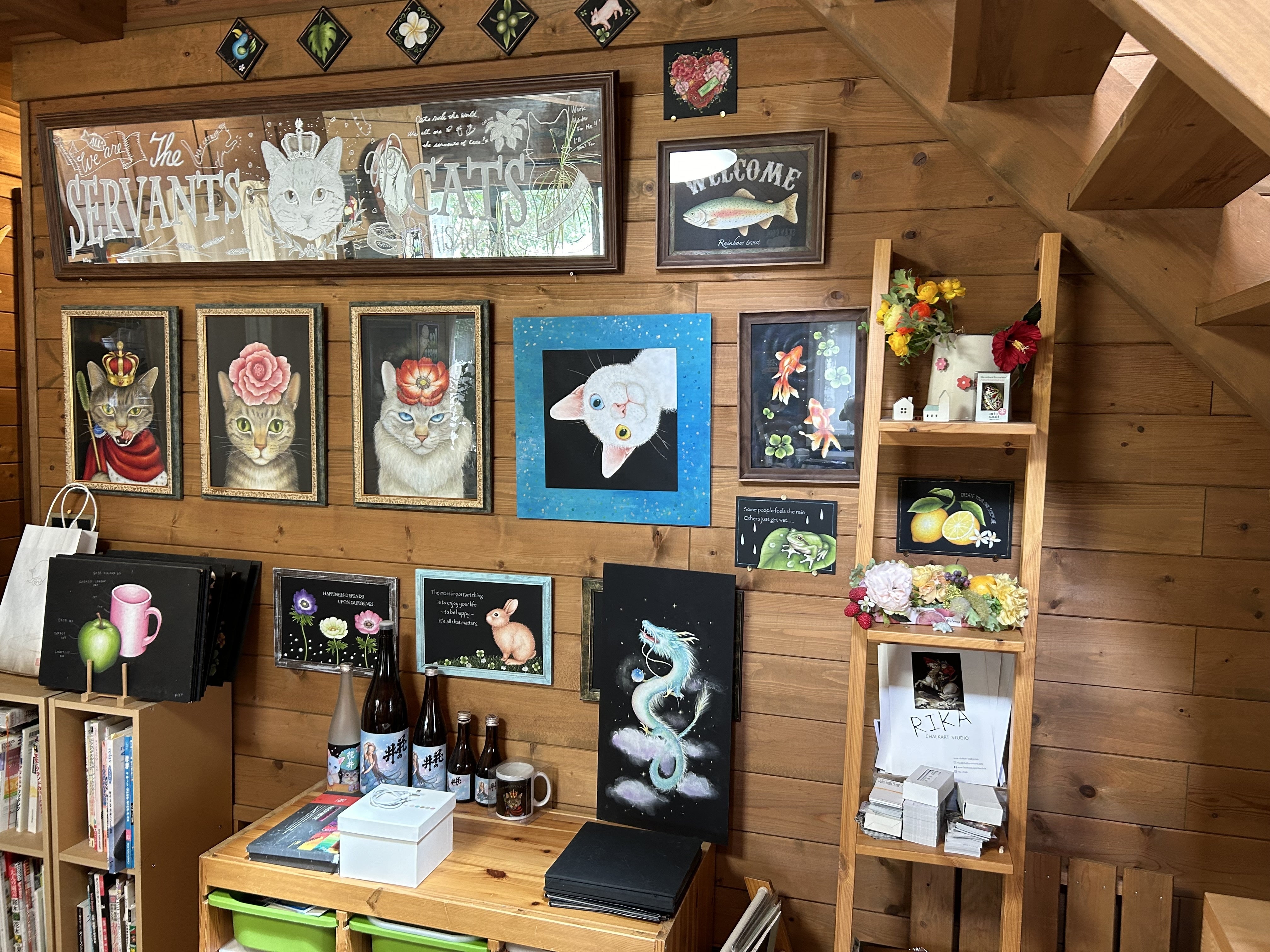 菊池理香さんのアトリエはチョークアートの絵がいっぱいで美術館のようなすてきなログハウスです。