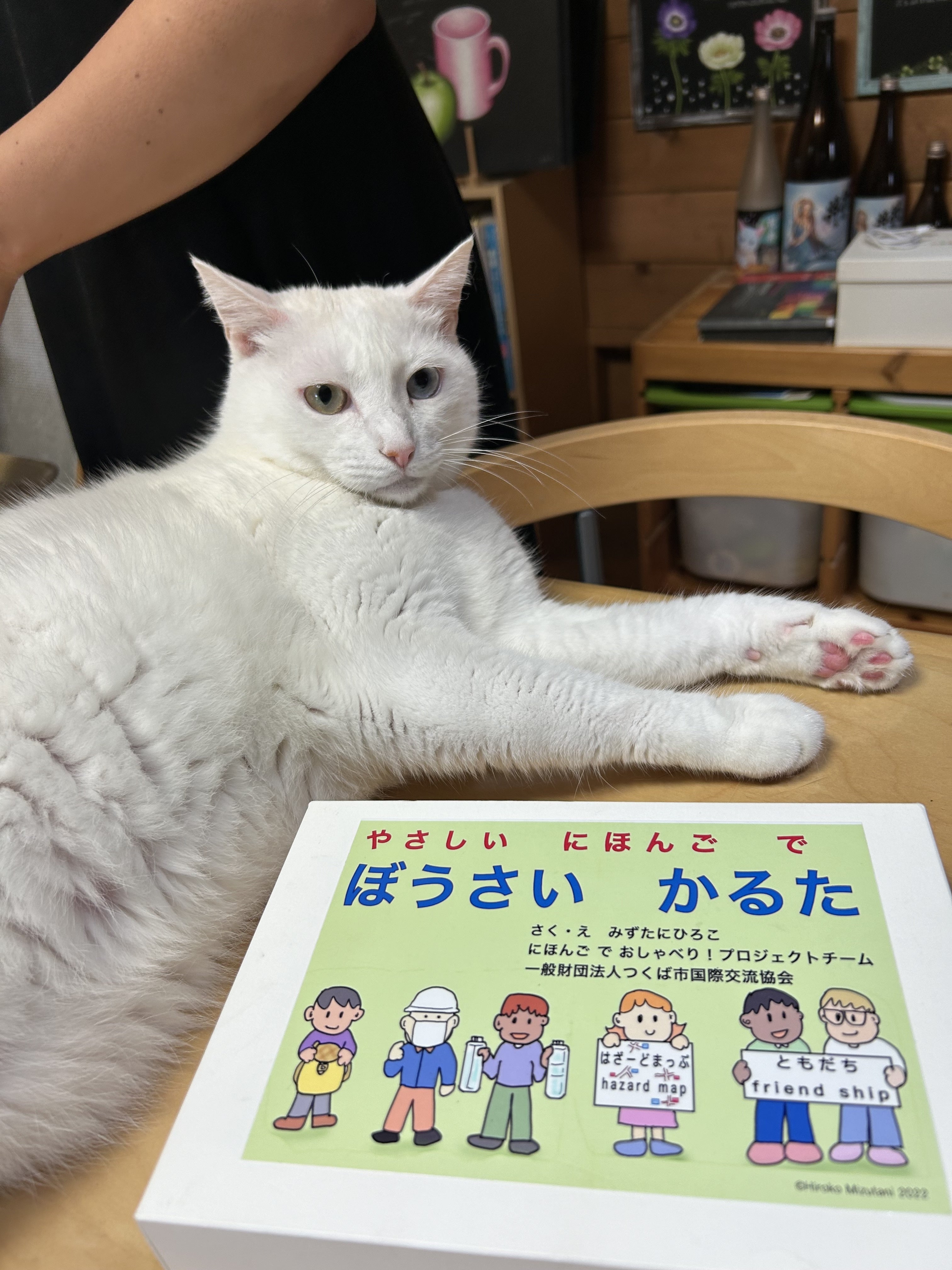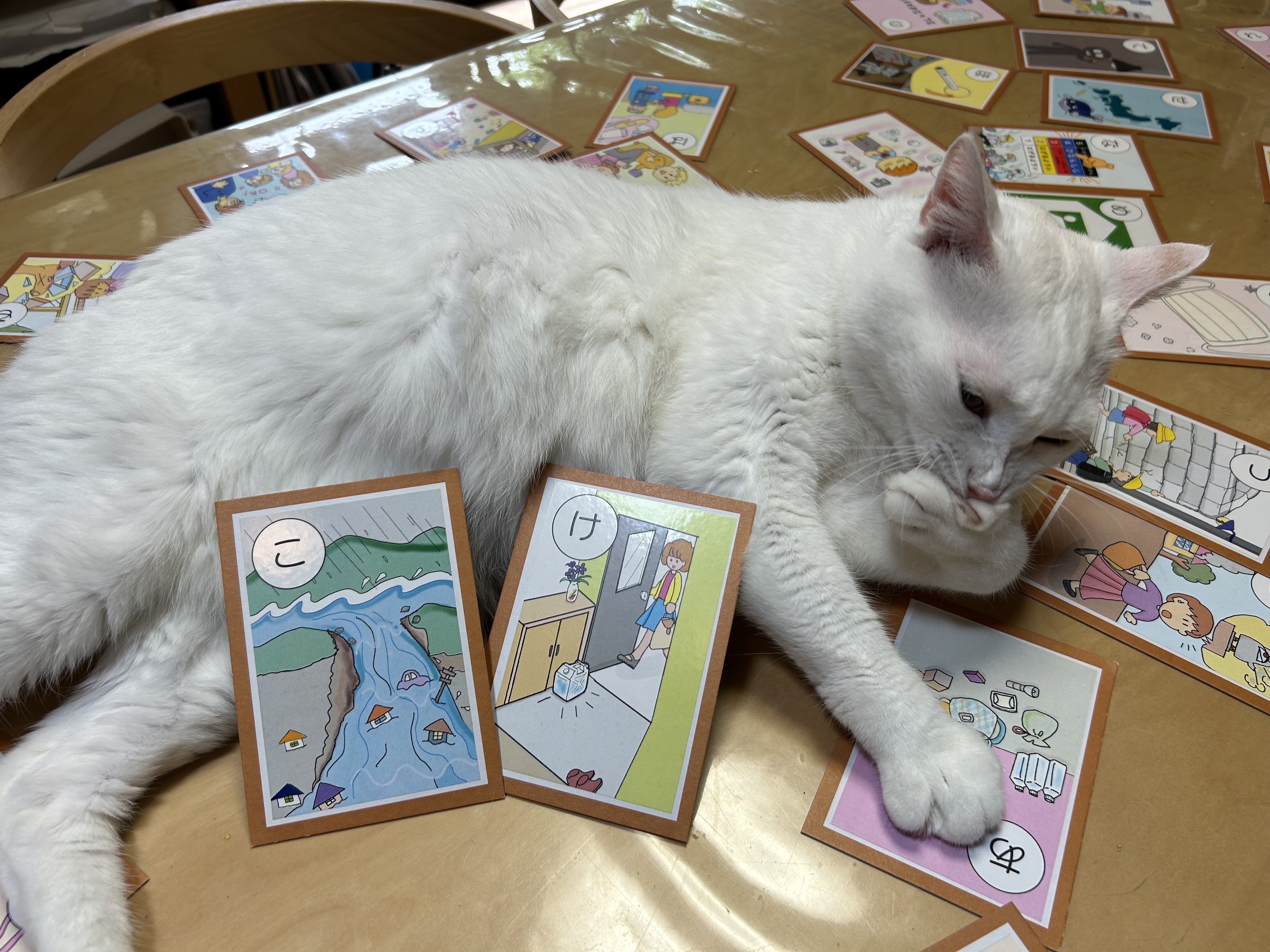 愛猫コゲ氏にもやさしいにほんごでぼうさいかるたを遊んでいただきました。実はこのネコちゃんは理香さんの制作意欲の源であり、パワーキャットさんなのです。