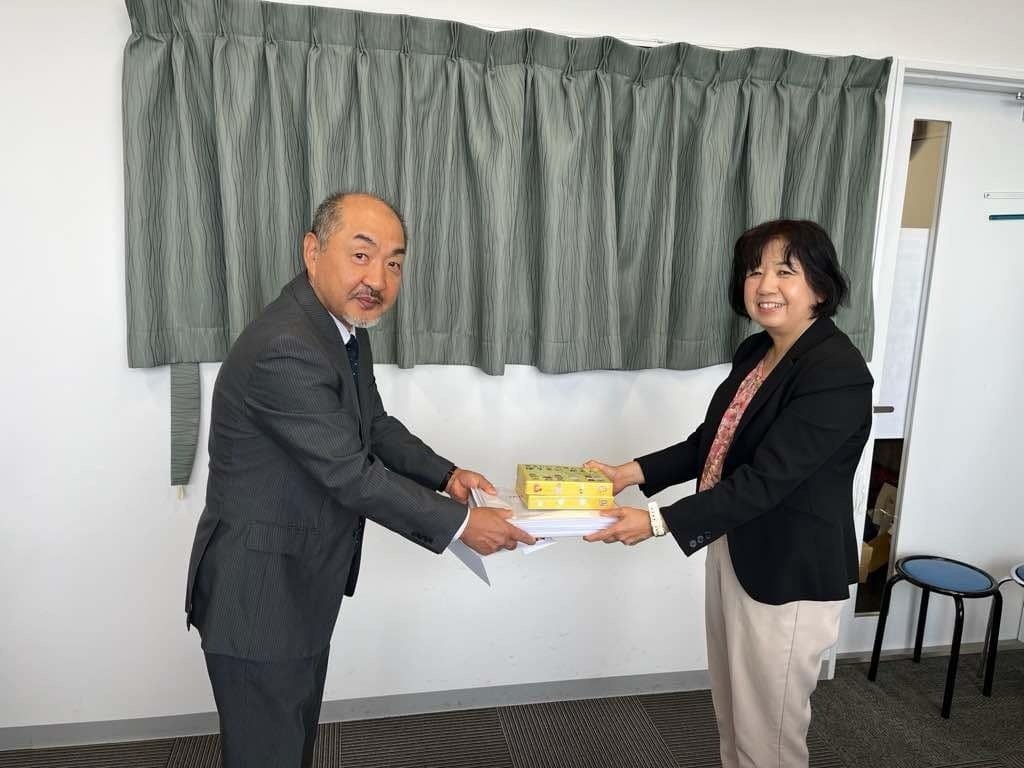 昨日、無事に「やさしいにほんごでぼうさいかるた」を、つくば市教育長に贈呈してまいりました。