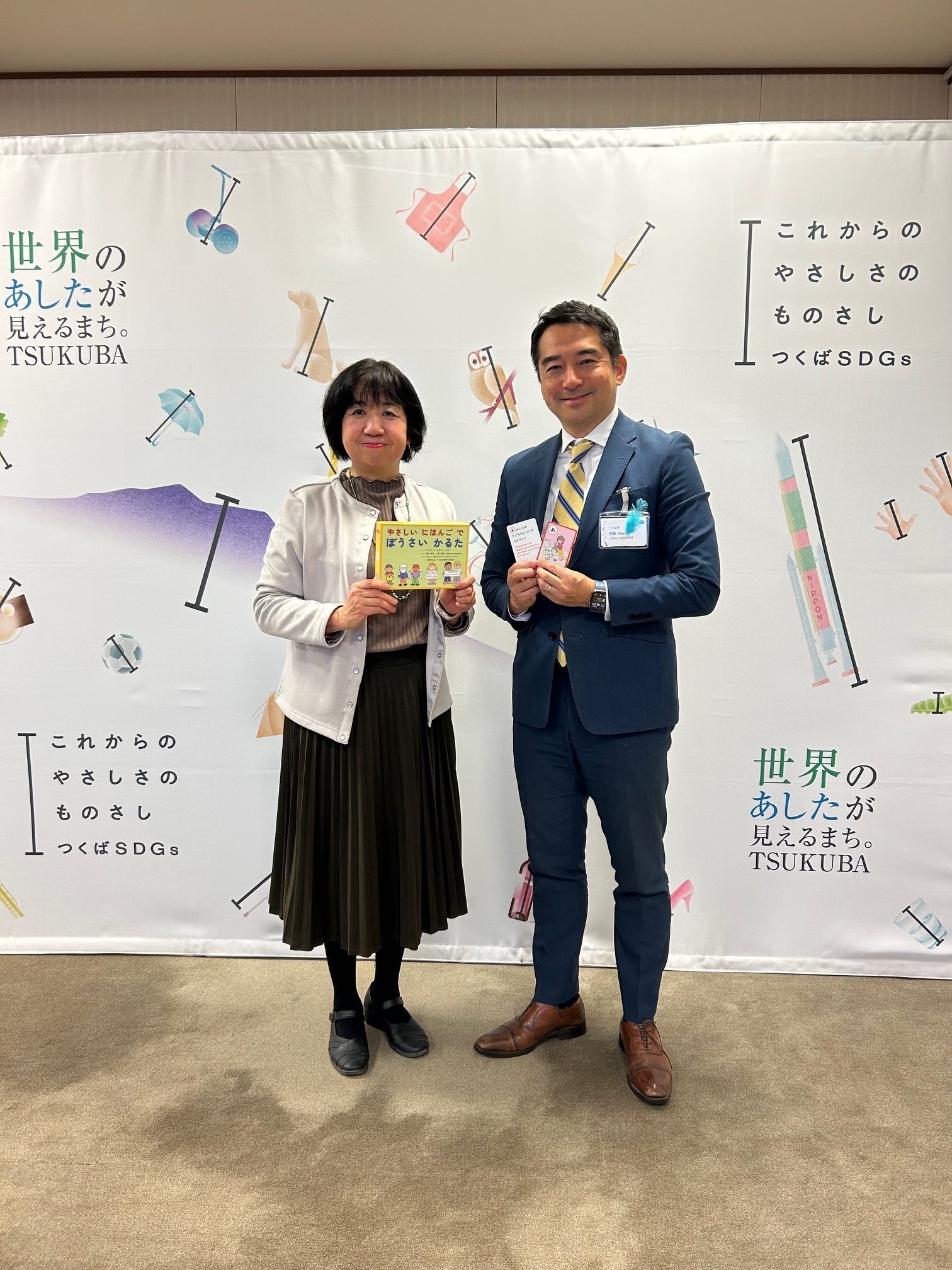 12月20日はつくば市五十嵐市長にかるたの報告をさせていただきました。市外の他の地域にも外国人がたくさん働いていたり、学校に通ったりしているので、このかるたで遊んでいただきたいとお願いしましたら、機会をとらえては話をしてくれるとおっしゃってくださいました。