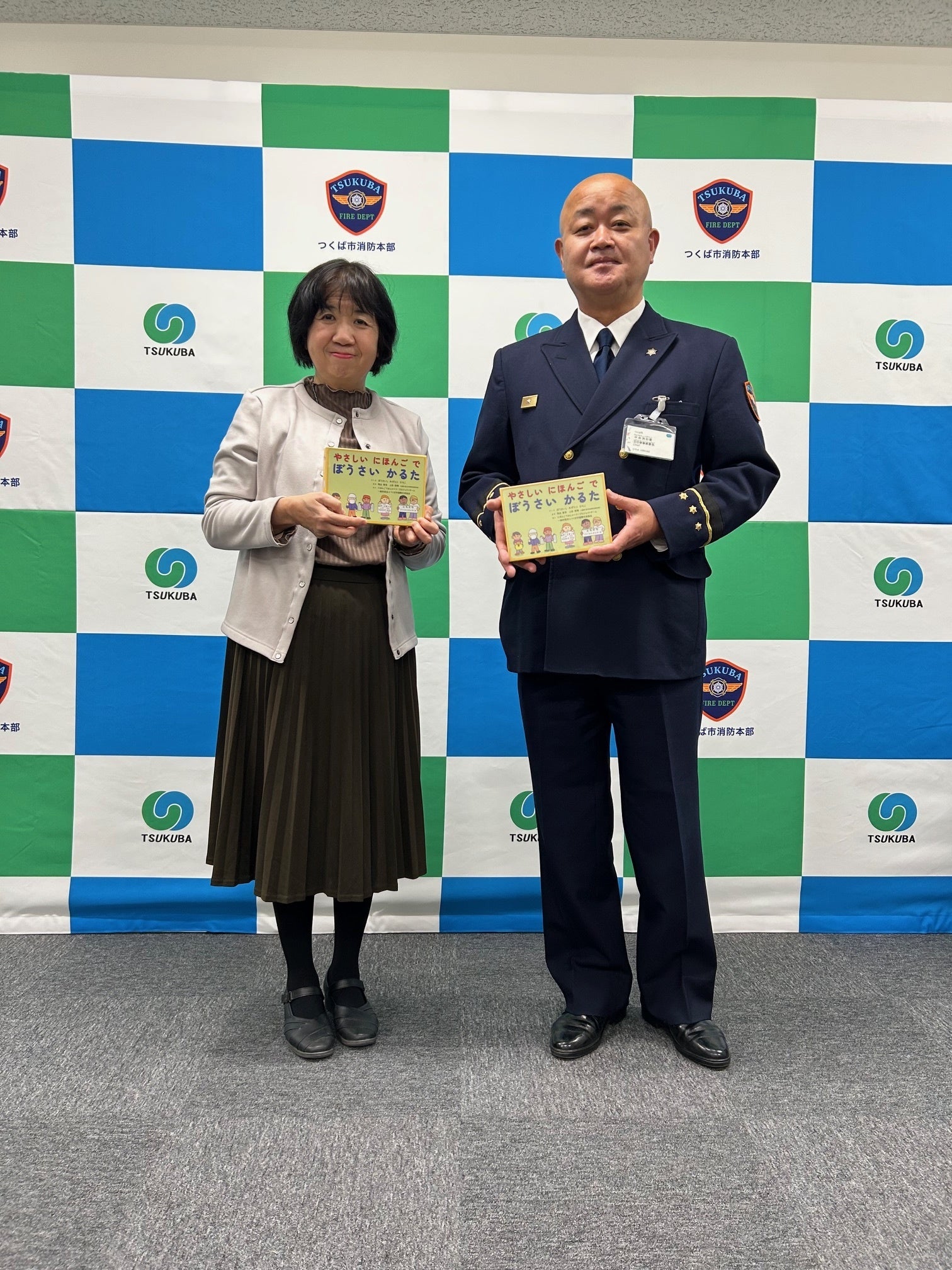 また、同日つくば中央消防本部へも赴き、かるたの寄贈とお話をさせていただきました。実は昨年12月に私が所属している「にほんごでおしゃべり!プロジェクトチーム」と「つくば市国際交流協会」の共催で外国人向けの防災イベントを行った時に、中央消防署様にも防災ワークショップをご協力くださった縁で、まだ出版される前の手作りかるたを見ていただいたことがありました。今回商品化されたかるたをお持ちして、ご協力くださったお礼も兼ねてお話をさせていただきました。
