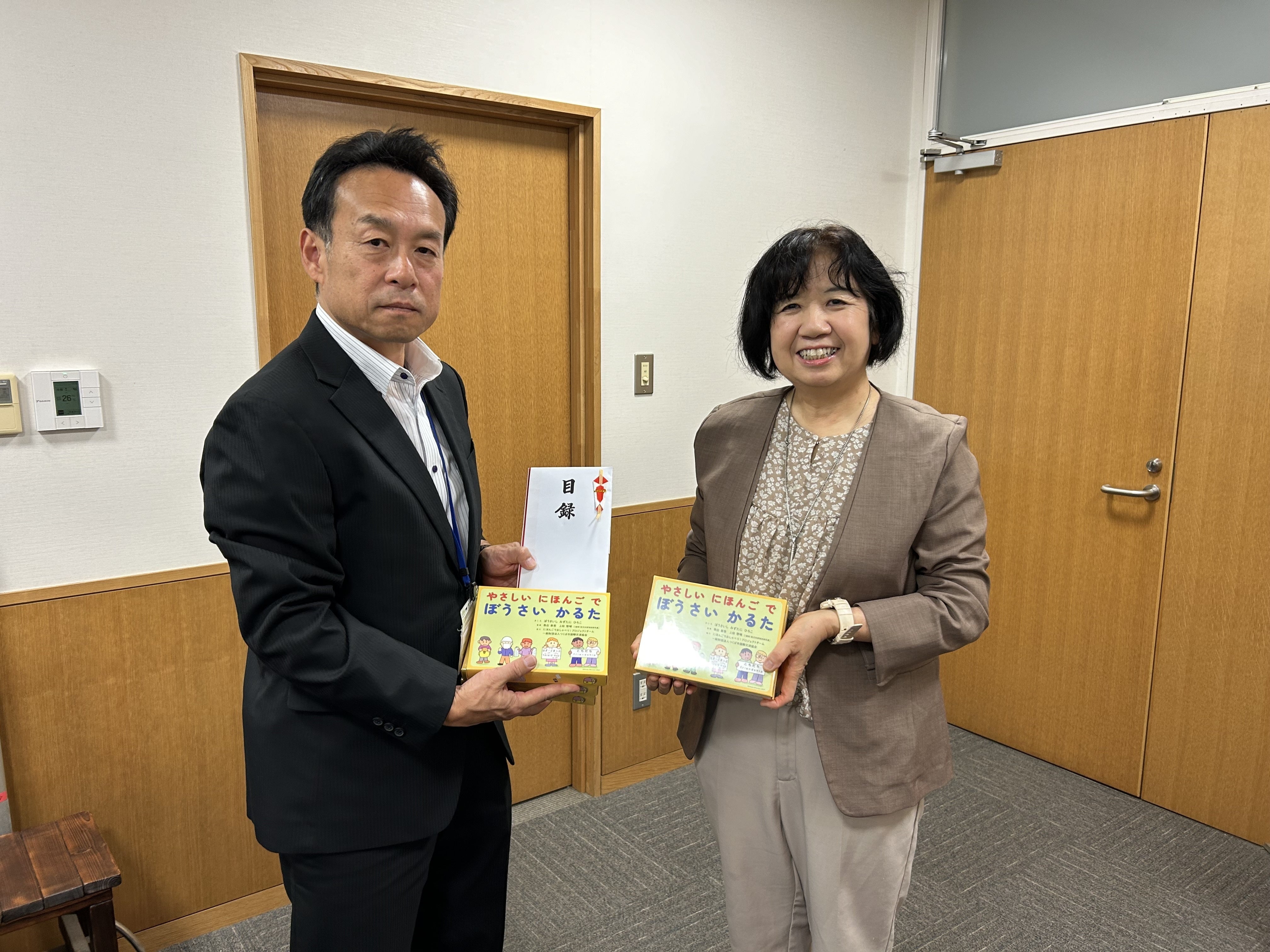 「やさしいにほんごでぼうさいかるた」を私はクラウドファンディングでつくば市内の全小中学校へ5箱ずつ届けたいというプロジェクトを立ち上げました。皆様の温かいご支援によりプロジェクトは目標額に達しました。本日は県立つくば特別支援学校へかるたを届けてまいりました。ぜひ、皆様で遊んでいただき、防災について学んでいただきたい旨もお話ししました。かるたはルールが簡単でわかりやすいだけでなく、いろいろな配慮をすることもできます。例えば子どもの年齢や発達によって、先生と生徒1対1で、枚数も3枚からでも始められます。また、グループで行う時も、取るのが難しそうだなと先生が感じたら、絵札をその子の向きにしたり、読み札を選んだり、他の子どもにはわからないようにさりげない配慮もできます。終わった後でも枚数を数えて、トップに拍手ー!と言う時と、全員拍手!という時もあります。子供達の様子をみながらいろいろなバリエーションができます。そんなお話をしながら校長先生にかるたを寄贈しました。また、目録にはご支援者のお名前を印し、感謝を込めて読ませていただきました。大切なかるたです。校長先生も大変喜んでくださり、学校の防災教育に役立てたいとのことでした。今後もつくば市立小中学校、つくば市内の私立県立中学校に届けます。皆様、本当にありがとうございます!