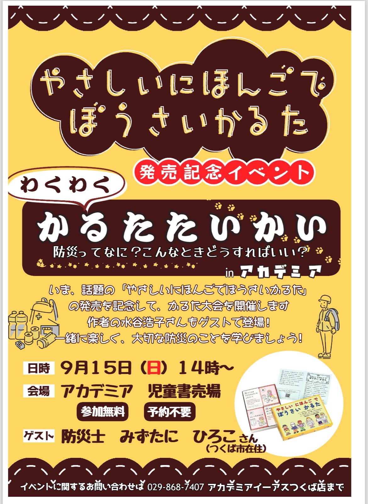 皆様 昨日「やさしいにほんごでぼうさいかるたをつくば市でひろめたい!」プロジェクトが終了いたしました。7月23日にスタートしたこのプロジェクトはわずか1日で半分の585,000円を突破し、8月19日に目標金額1,170,000円に到達し、さらにネクストゴール「つくば市外へもひろめたい」についても目標だった230,000円が集まり、合計1,401,500円のご支援が集まりました。皆様が大切なお金をご支援くださったこと、また、たくさんご拡散、ご紹介、ご協力をくださったこと、本当に感謝しかありません。ありがとうございます。このご支援にたいする御恩に報いるよう、私はこれからも「やさしいにほんごでぼうさいかるた」を子どもたちや外国人の方々、すべての方々へ広めていくよう全力で取り組んでまいります。まずは、つくば市全小中学校へかるたを5箱ずつ寄贈をさせていただきます。日程は10月中~下旬になる予定です。つくば市教育局へ届けます。また、ネクストゴールでの「この学校、この機関、へ届けたい」についても順次お名前をいただいた学校、機関へ案内を送り、このプロジェクトの趣旨をご説明してかるたを寄贈していきます。さて昨日は、イーアスつくばのアカデミア書店さんでかるたのイベントをさせていただきました。子どもたちも興味津々で集まってくれ、2時間休みなしでかるたを続けました。小さい子どもたちの中には何度も参加してどんどん上達していく子もいて、とても楽しい時間となりました。このかるたは、取った後にそのカードを皆に向けて共有することに価値があります。その際に私がひとことアドバイスをします。このかるたの箱の裏にQRコードがあり、お買い上げの方にはこのアドバイスの載った説明書をメール添付にて差し上げております。これからも私はこのかるたを通じて、たくさんの方が防災を生活に取り入れ、少しでも安心な生活をしていただけるよう尽力してまいります。どうぞ、よろしくお願いいたします!