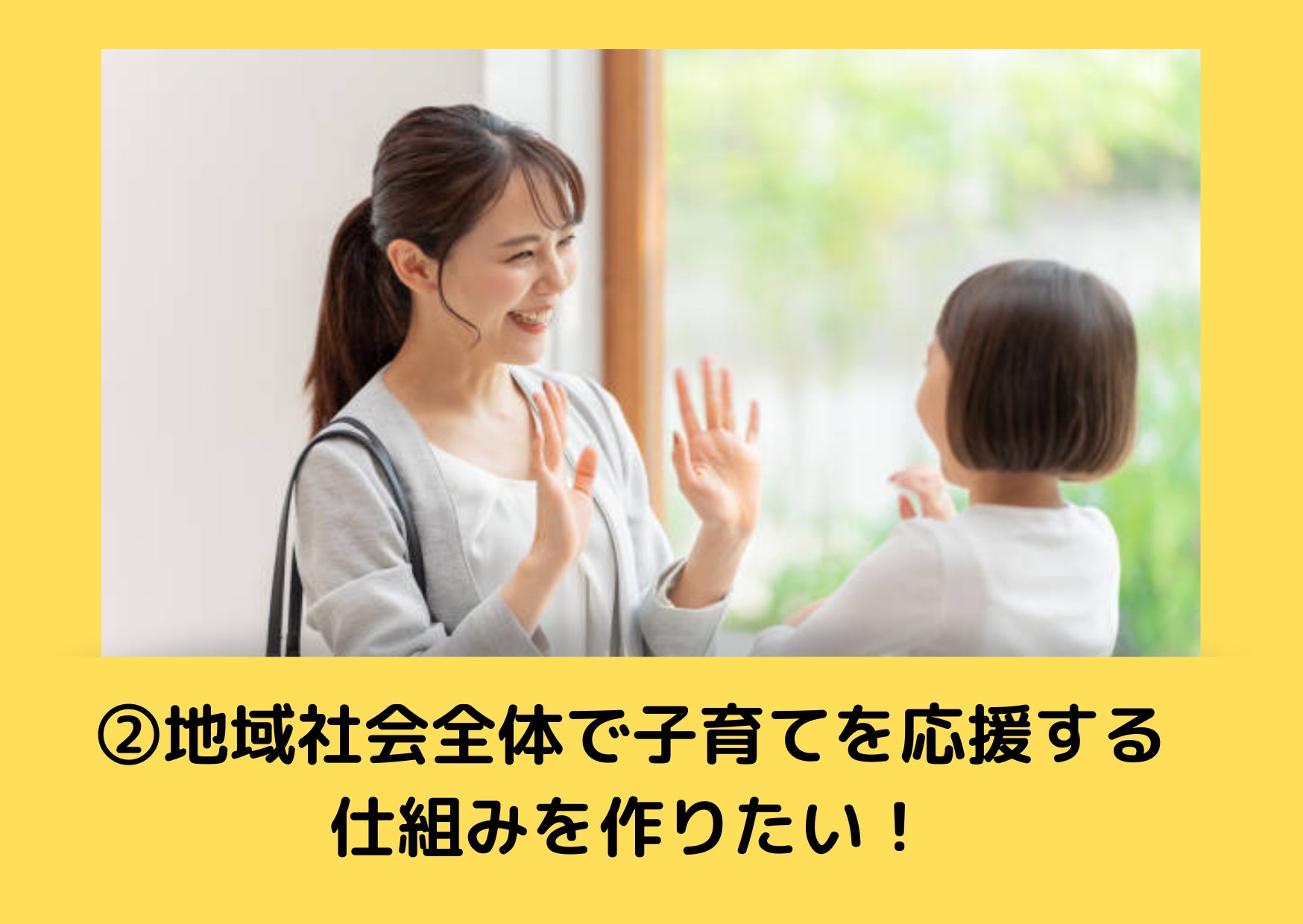 ②企業と提携して、福利厚生の一環として「子育て世代が休みの日に子どもを預けてきちんと心身の休養をとれる」環境を作り、ワークライフバランスを整えることで「子育てしやすい地域社会」にしたい!
