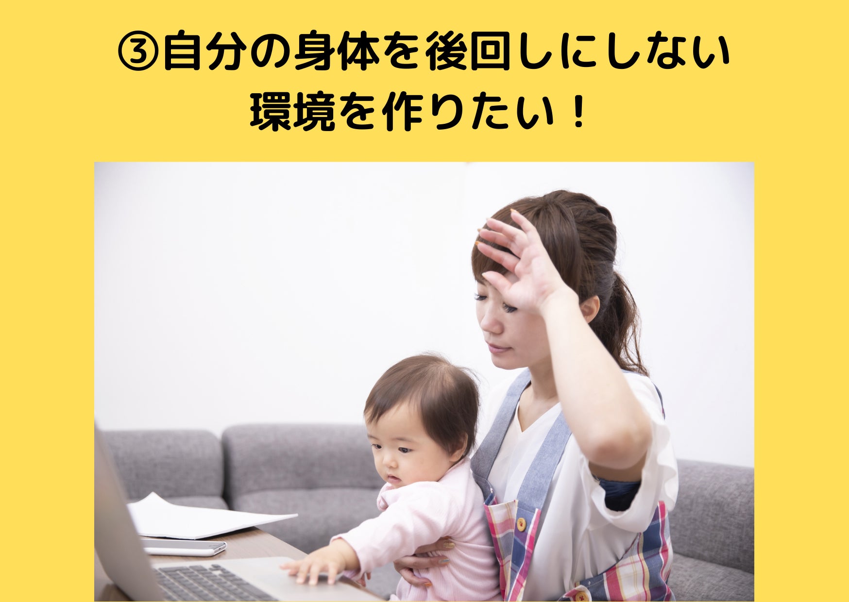 働きながら子育てをしている皆さんがキャリアアップやスキルアップを諦めなくていい環境づくりのお手伝いをいたします。