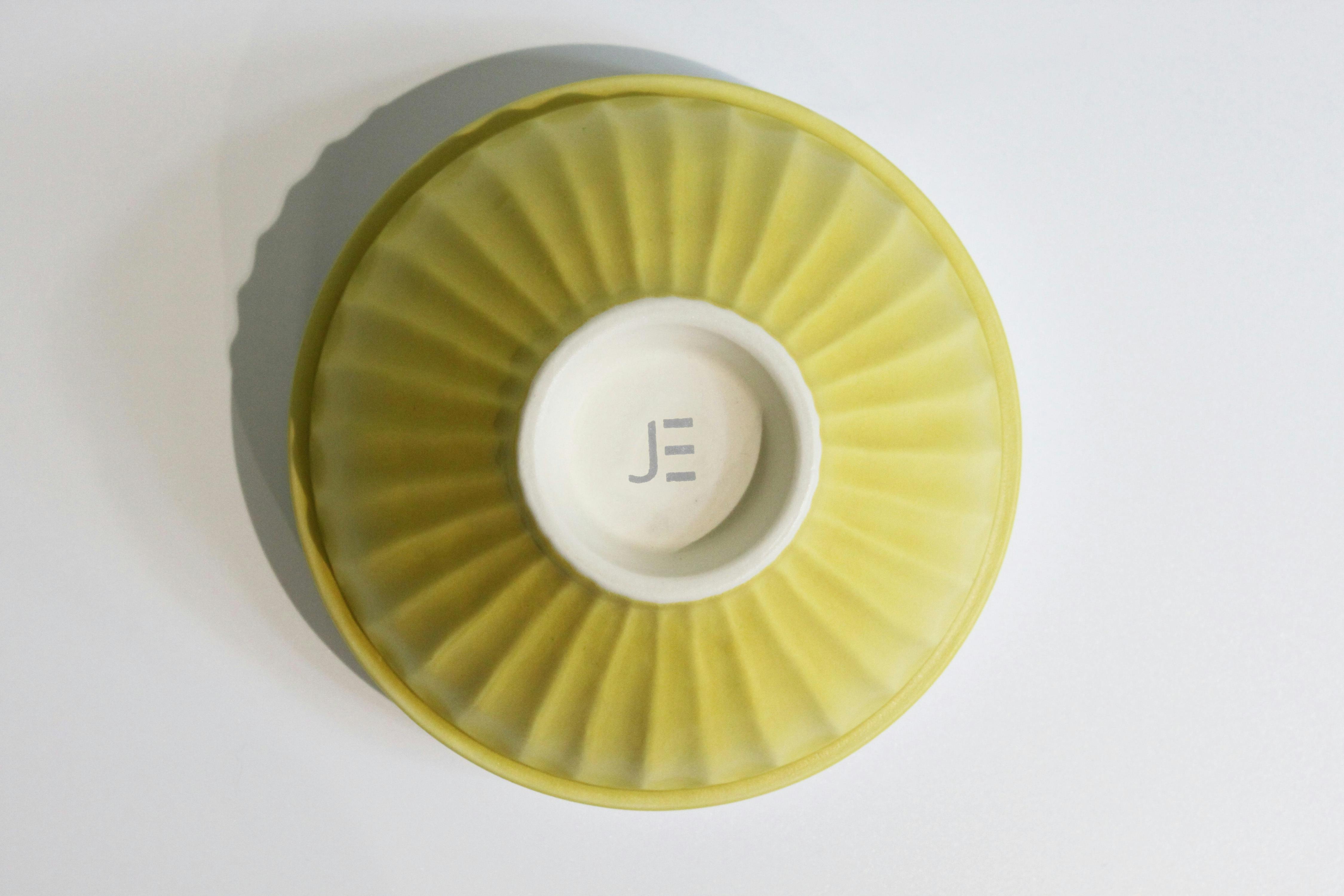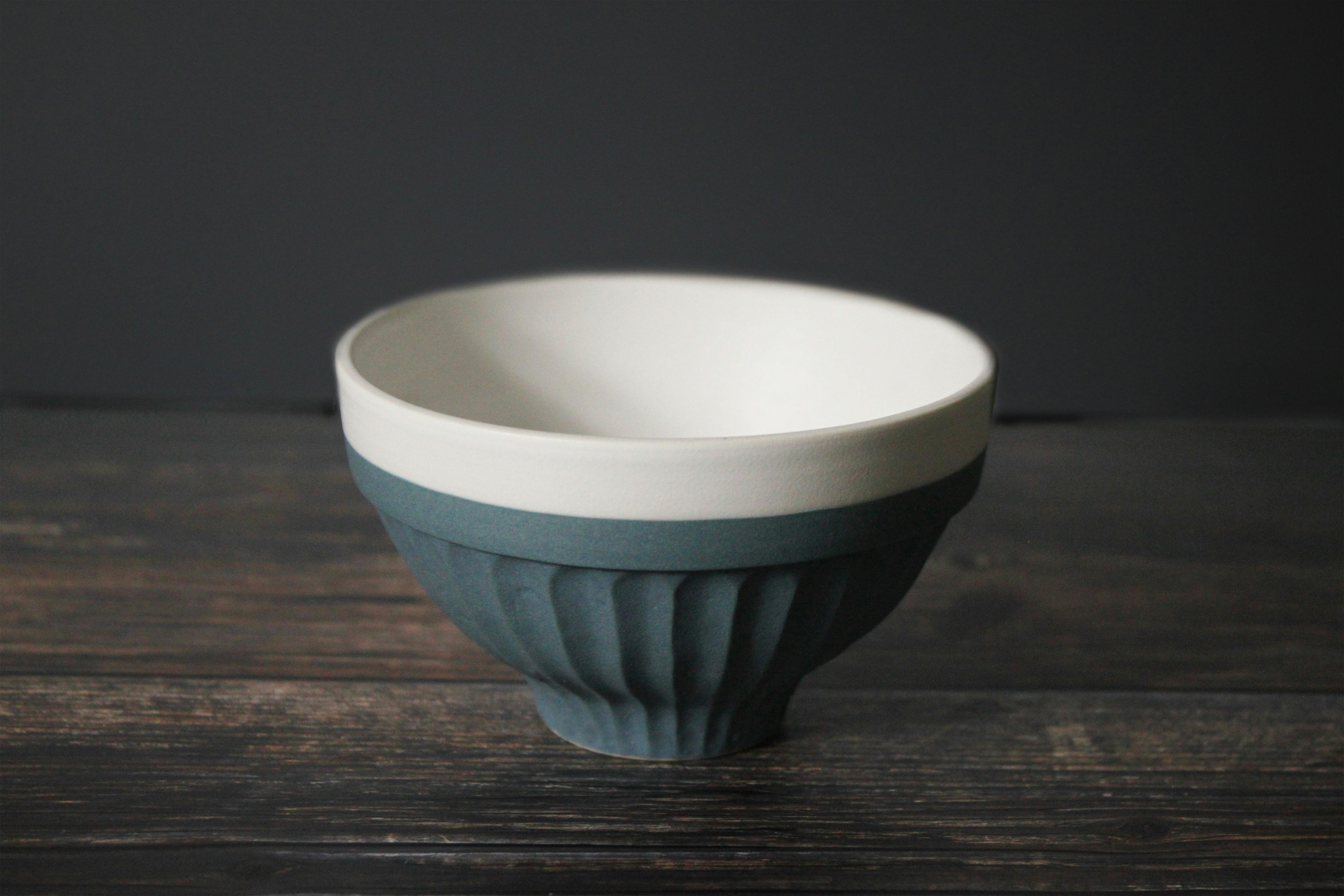 スタッキング(積み重ね)の精度:碗の側面に大きな段を作った特殊な形状です。コップよりも大きく、プレートよりも深い形状はスタッキングで重なるようにしたくても歪やすく、非常に難しい形状です。今回製造して頂くこととなった工場では焼く際の温度や置き方など工夫をしてまっすぐにスタッキングができる形状に仕上げています。