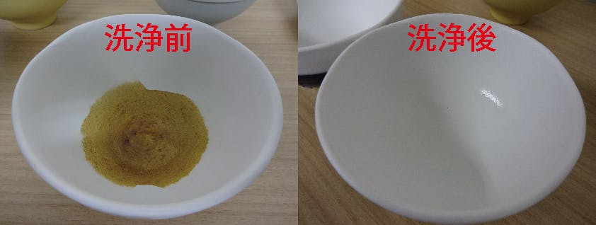 写真:醤油や焼き肉のタレを、一週間放置した後の洗浄具合を調べました。