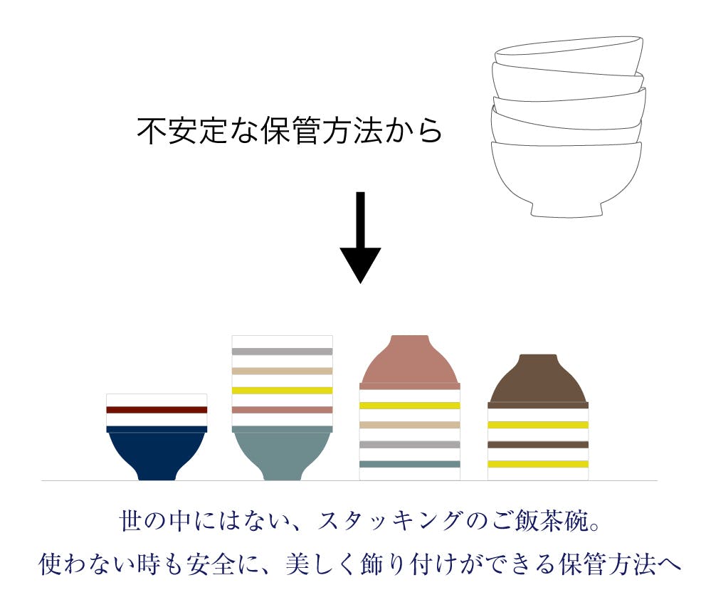日本の食卓には、欠かすことの出来ないご飯茶碗。家族の分だけ、きっと用意される食器だと思います。中には、自分専用の色や形の茶碗を持っている人もいる事だと思います。そんな誰しも持っている茶碗に、 新しい楽しみをプラス出来ないかと考えました。そこで注目したのは、使わない時に置かれている状態でした。不安定なバランスで重なった商品や、重なった状態では、色がわからない商品もあり、見た目だけでなく、安全面でも問題があると感じました。