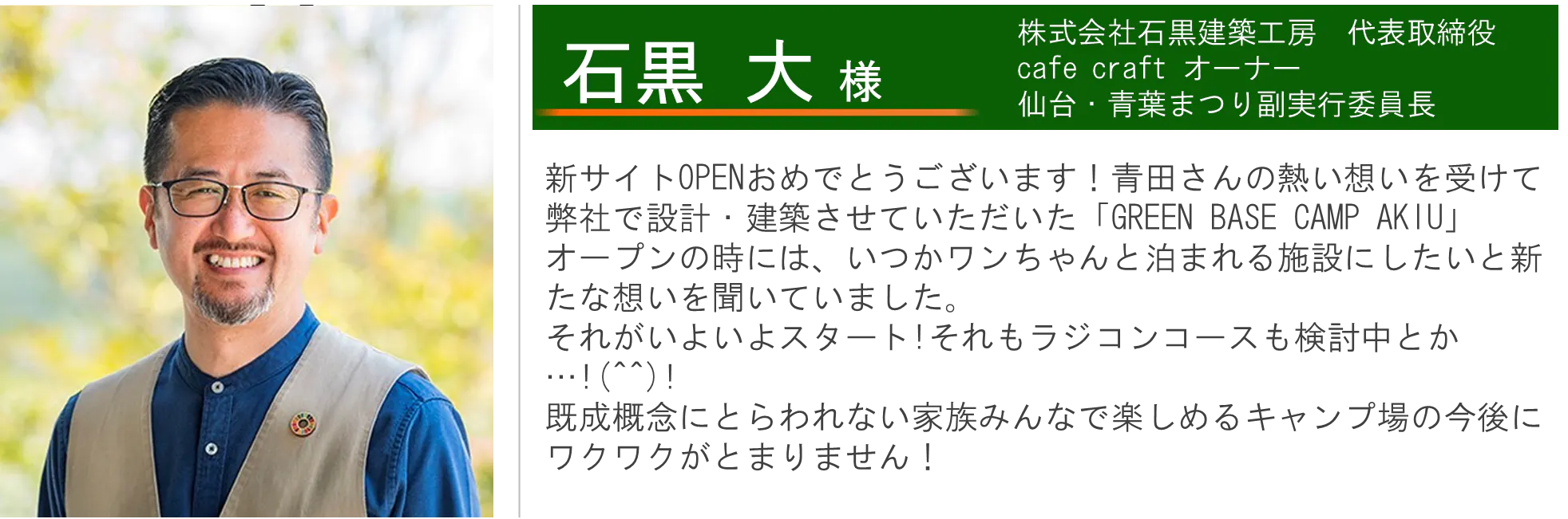 そんな私が、2022年10月にスタートしたキャンプ場が「GREEN BASE CAMP AKIU」です。もともと趣味でキャンプをしていたのですが、子供ができて行きにくい変化もあった中で、子連れでも気軽に行ける理想のキャンプ場を作りたいという想いが芽生え、実行に移しました。