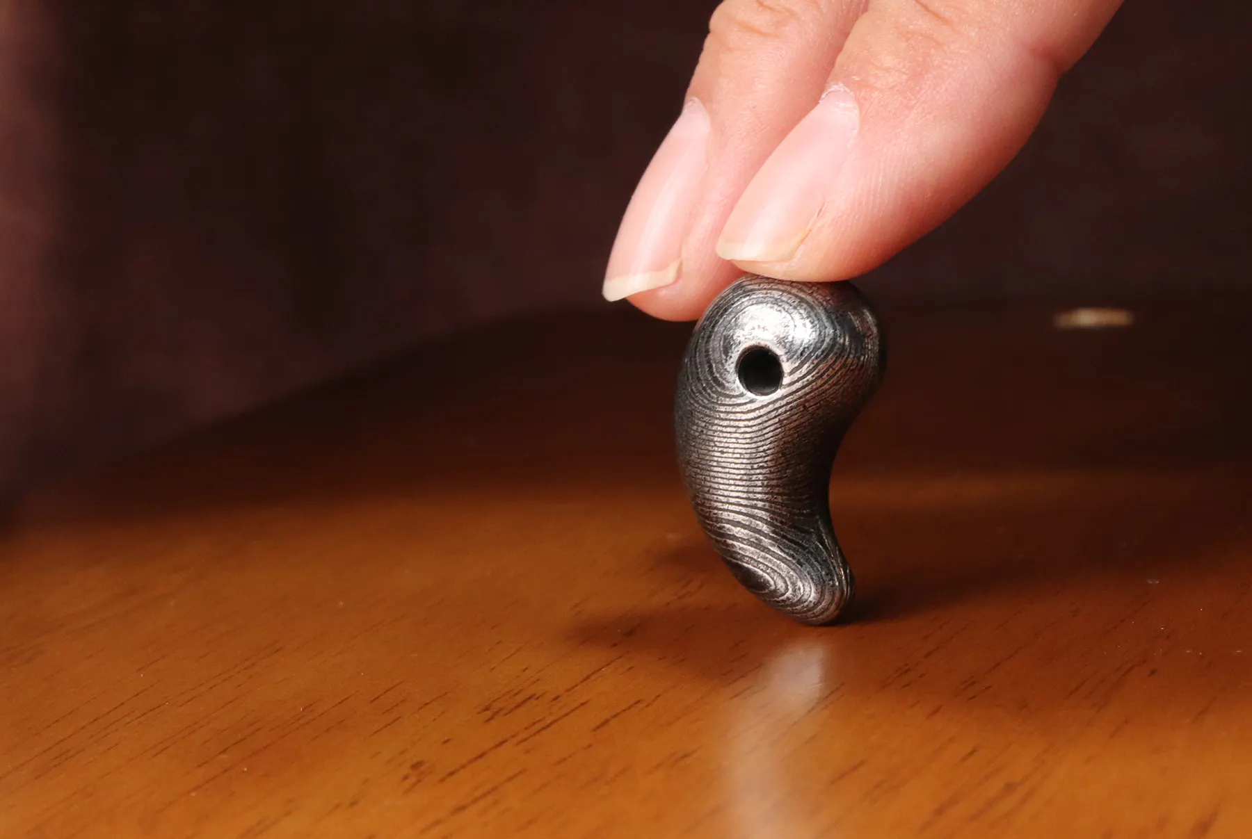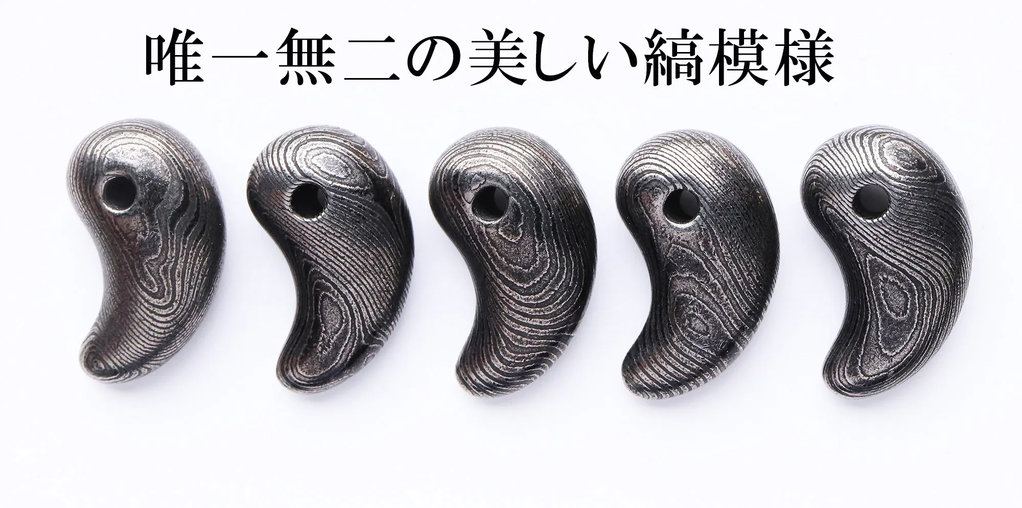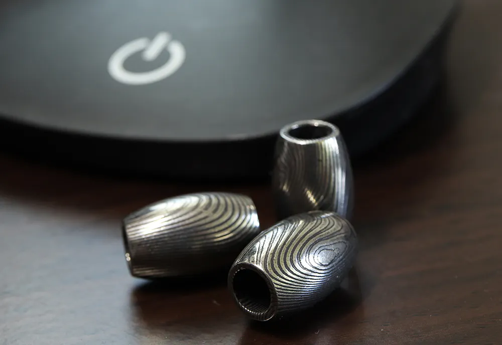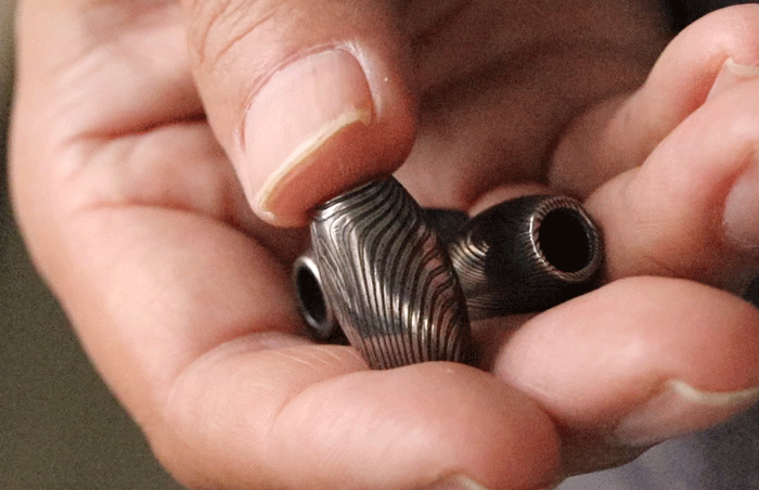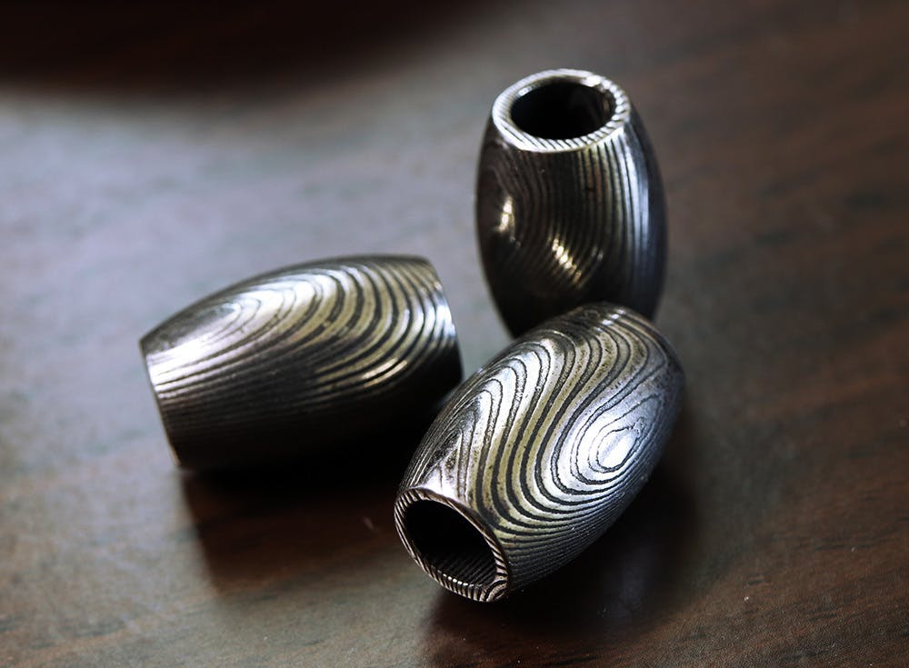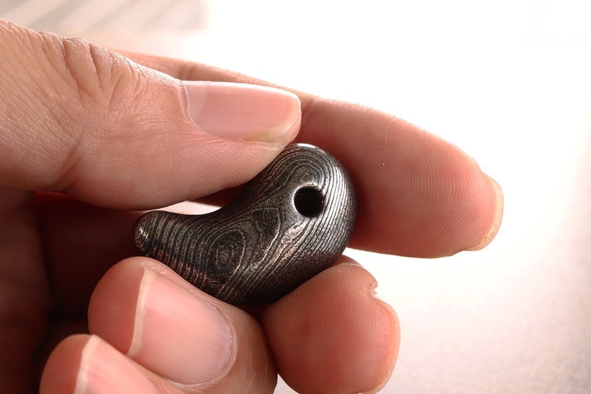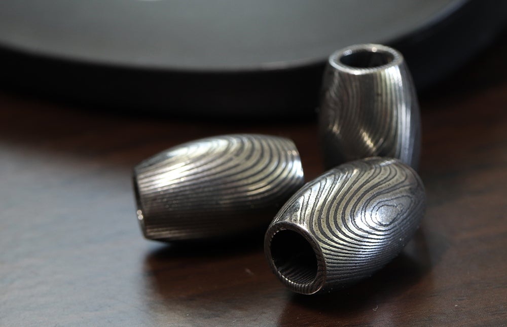 ご案内するのは、ダマスカス鋼を削り出して制作した「勾玉」と「バレルトップ」の2種類をご案内いたします。