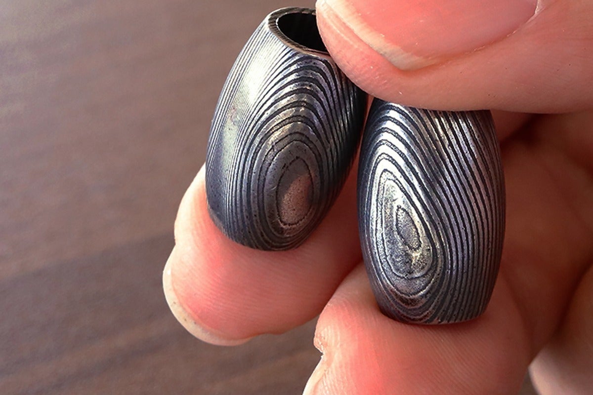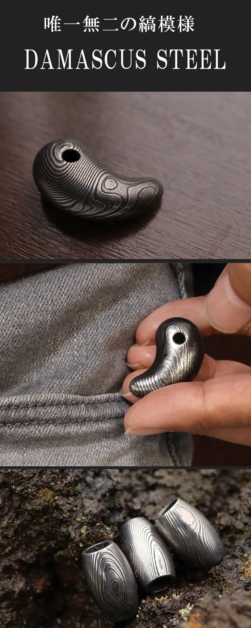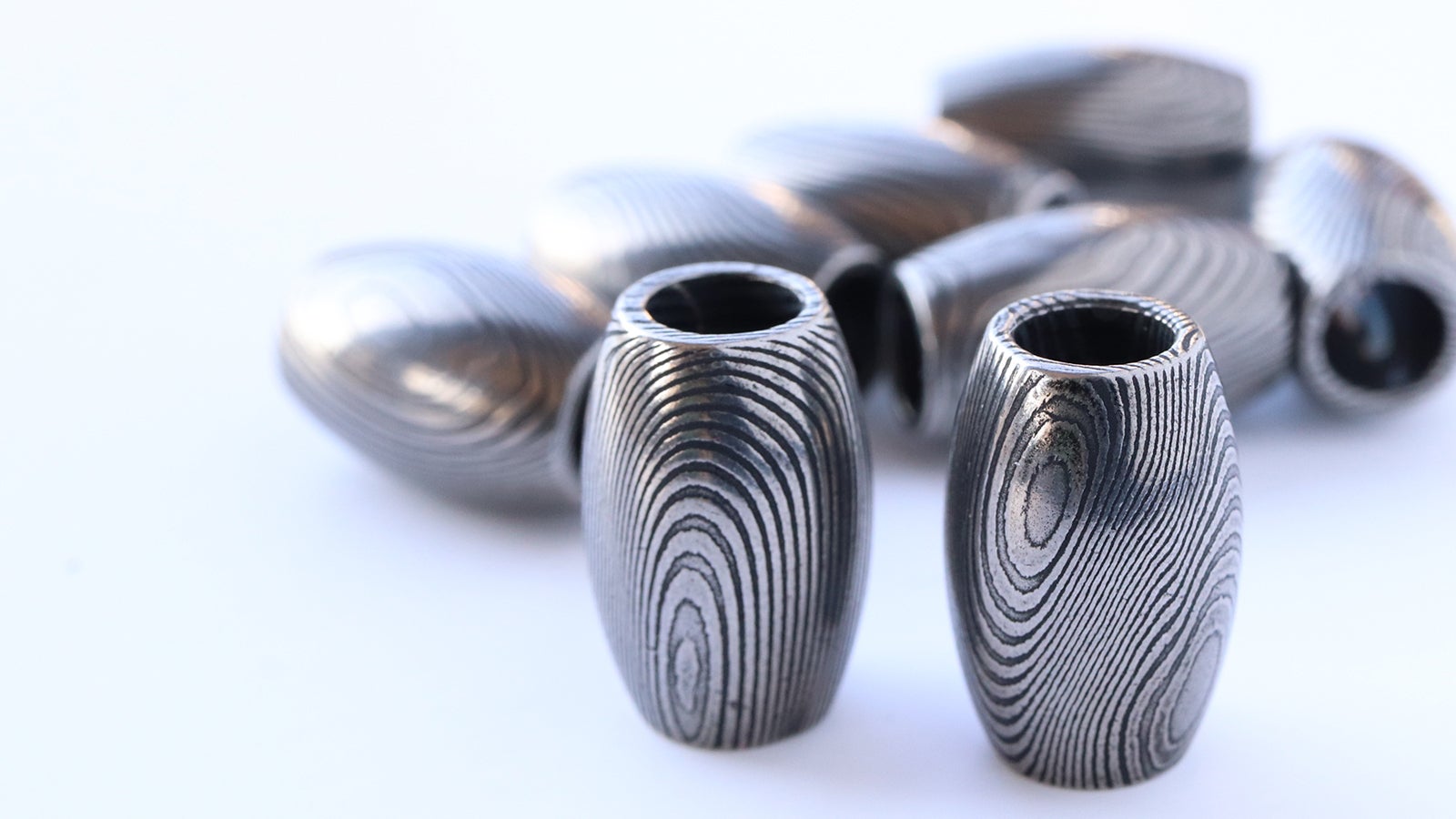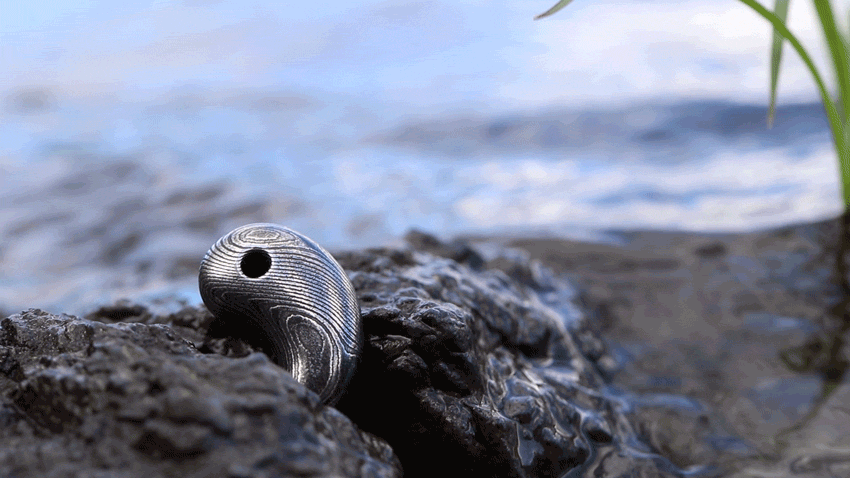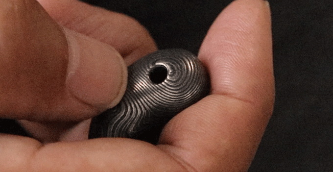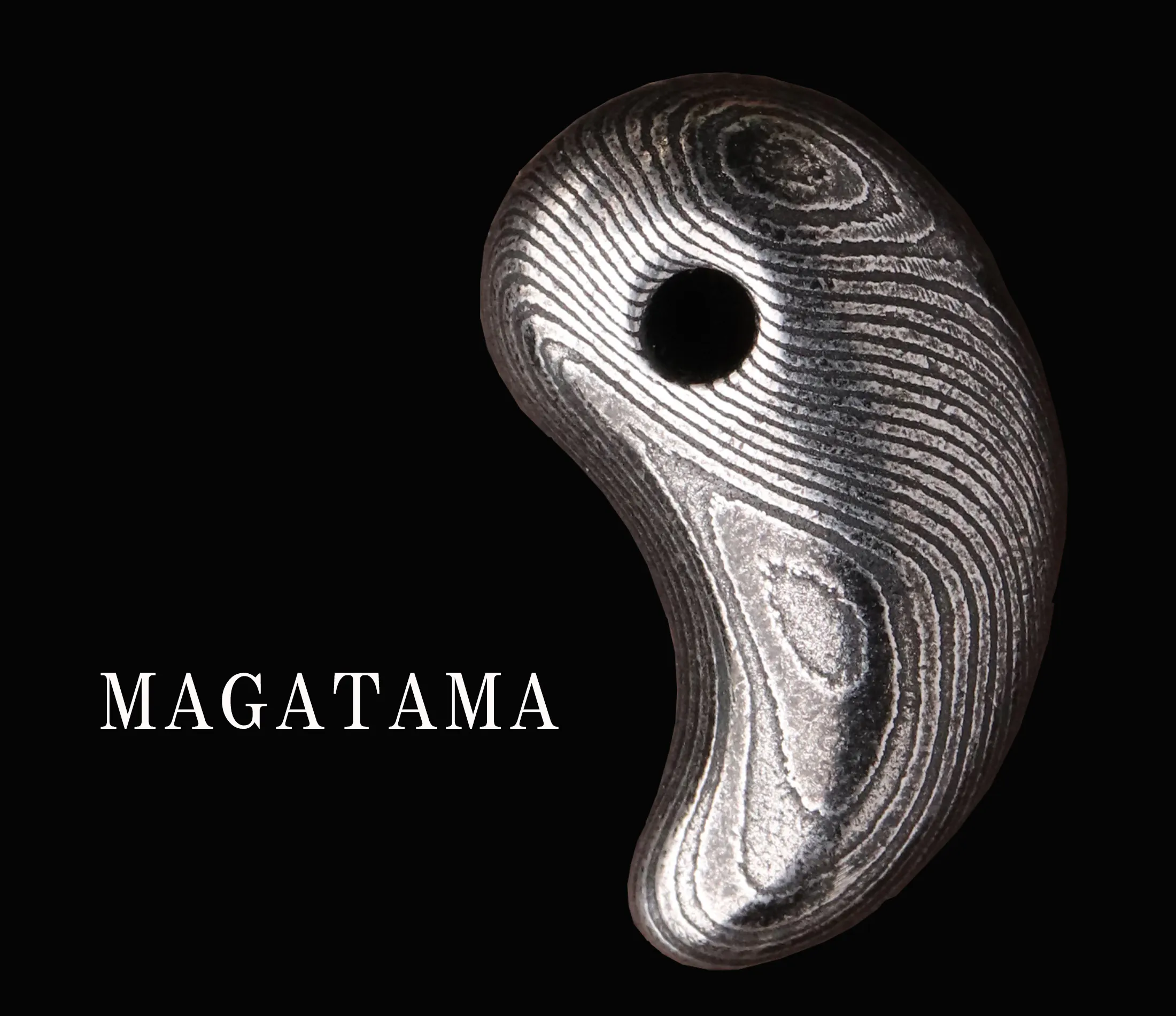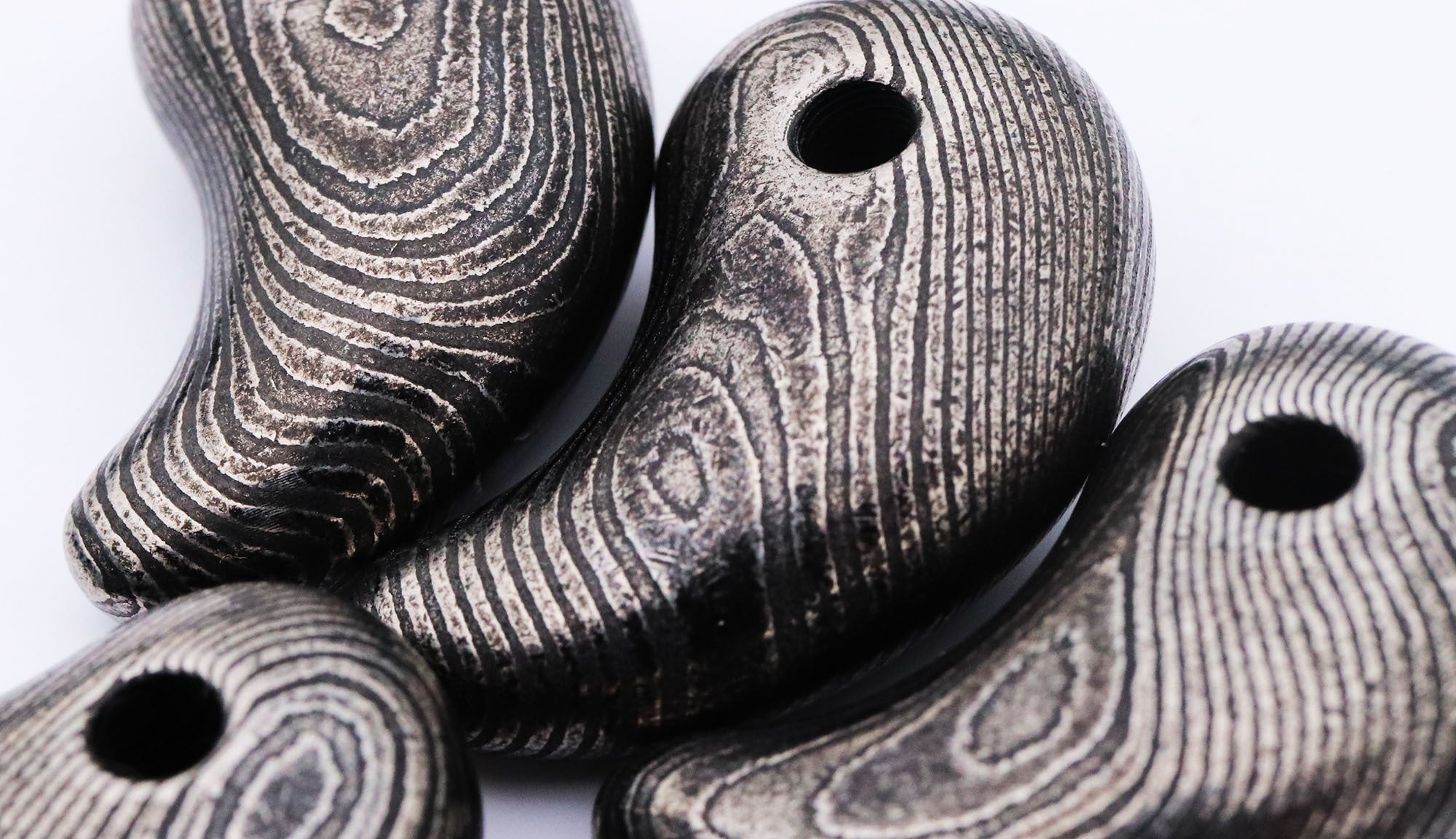ご案内するのは、ダマスカス鋼を削り出して制作した「勾玉」と「バレルトップ」の2種類をご案内いたします。