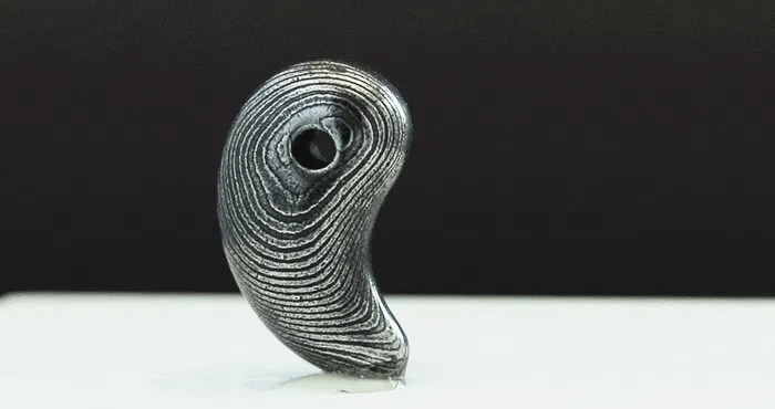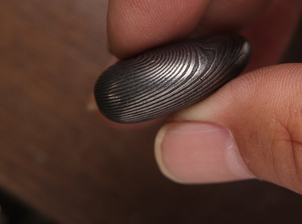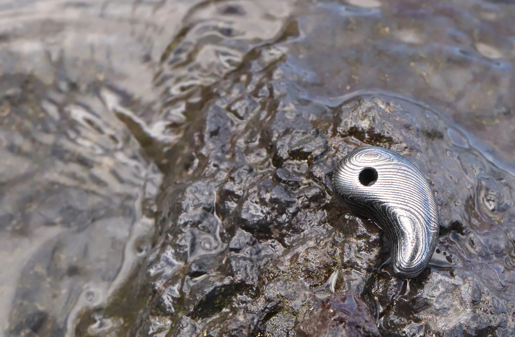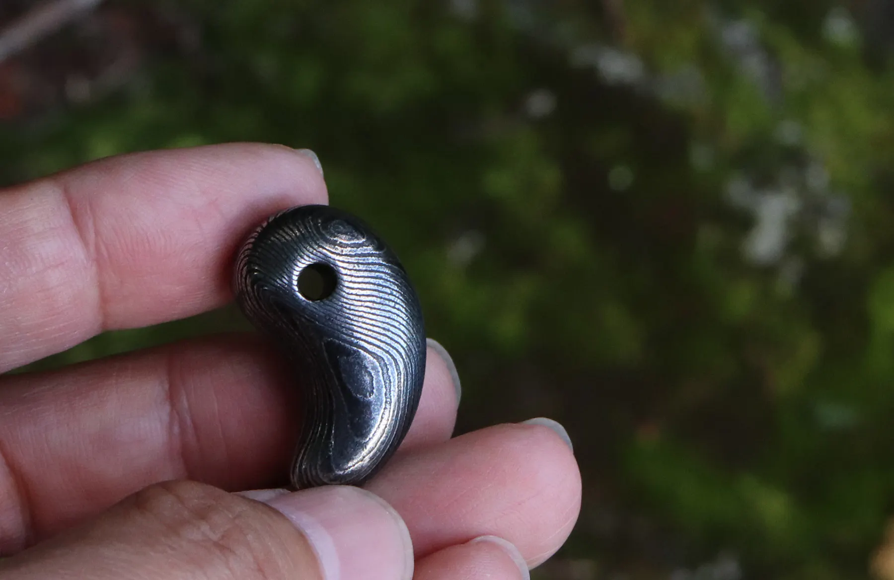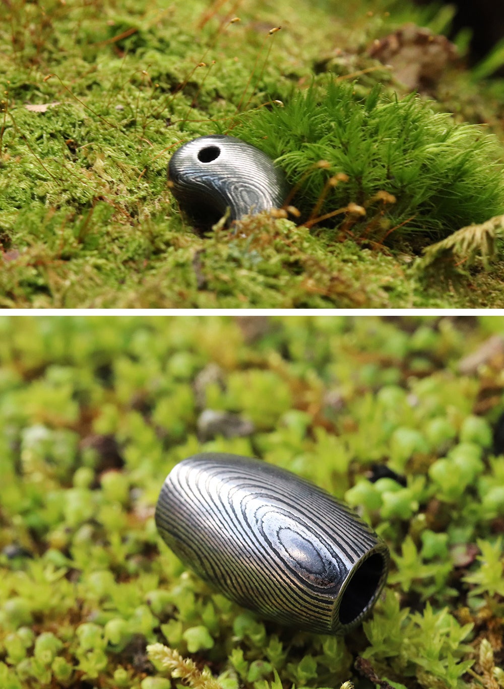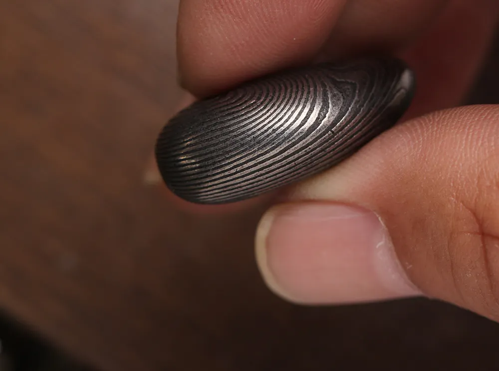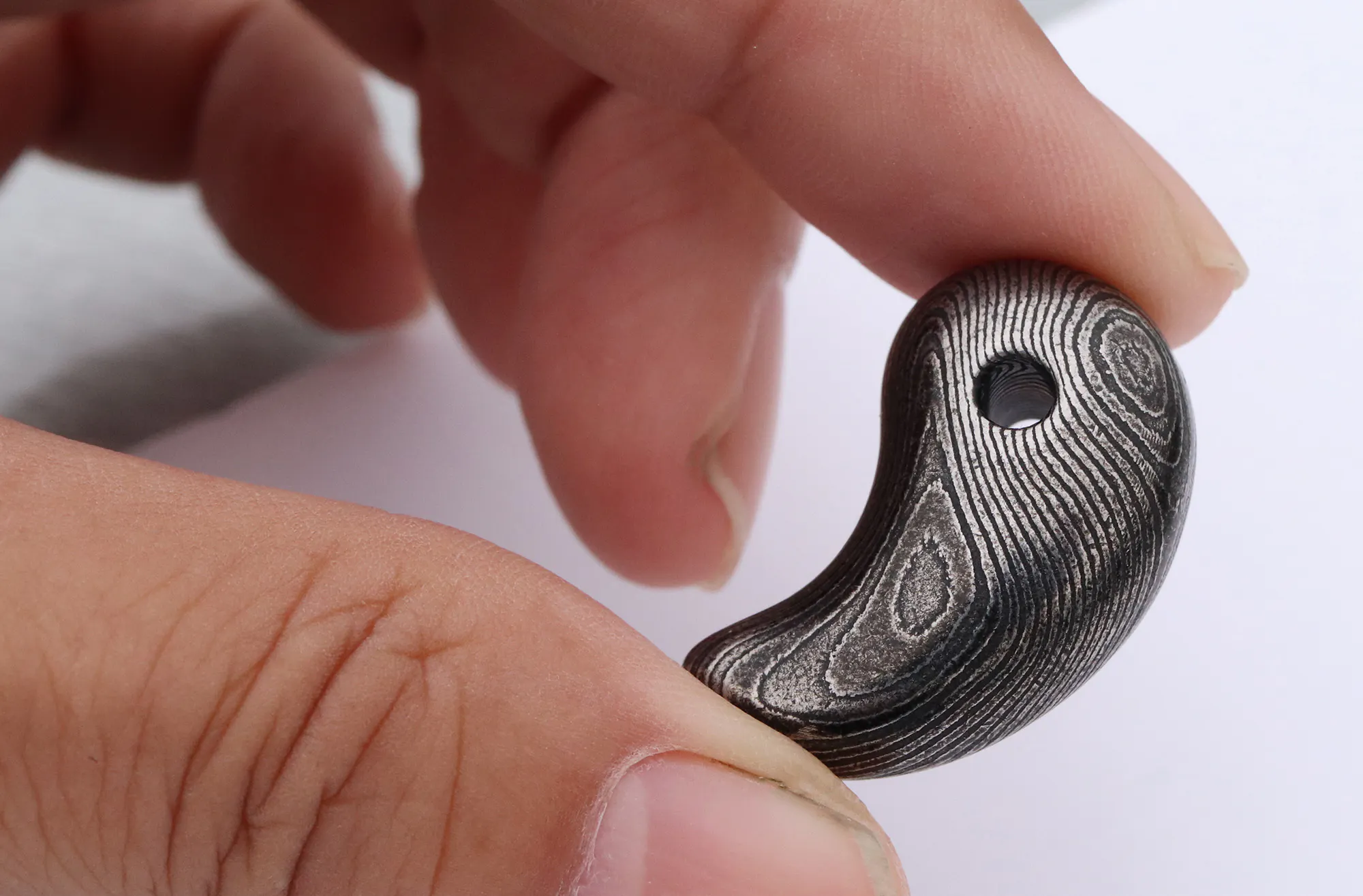 ご案内するのは、ダマスカス鋼を削り出して制作した「勾玉」と「バレルトップ」の2種類をご案内いたします。