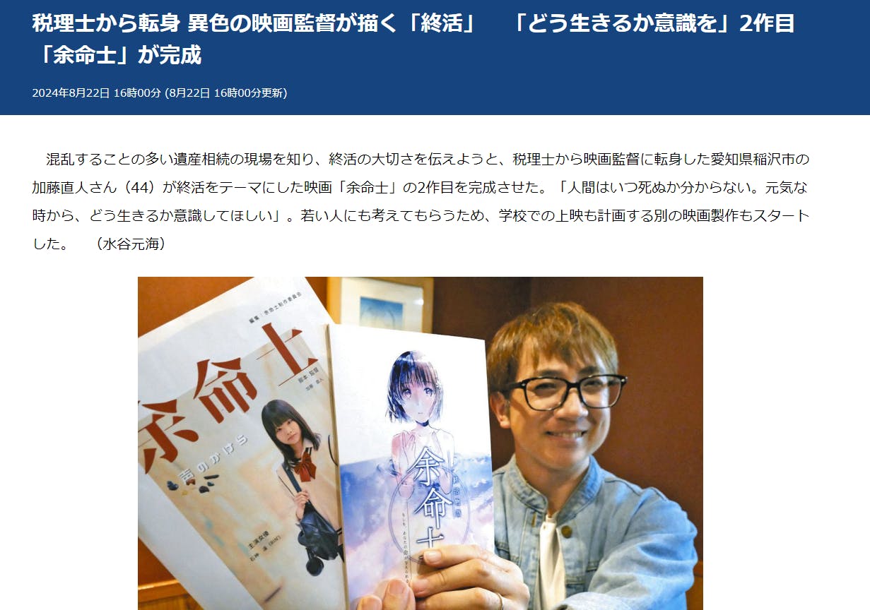 税理士から転身 異色の映画監督が描く「終活」 「どう生きるか意識を」2作目「余命士」が完成(2024年8月22日 中日新聞)