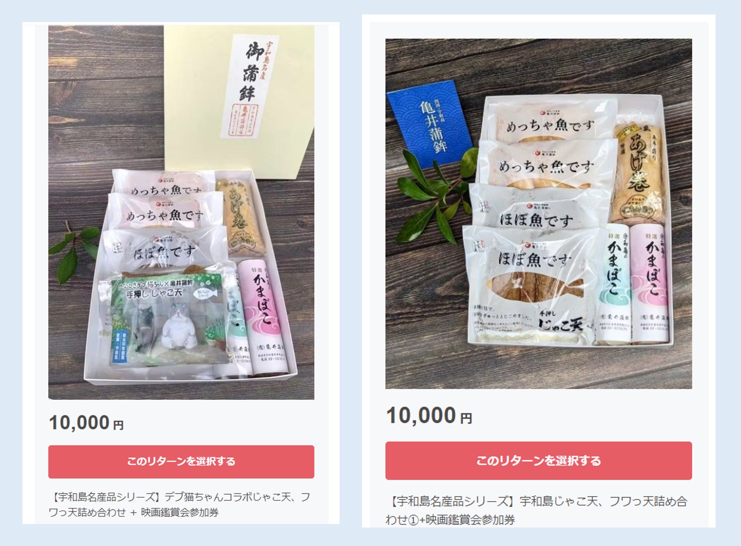 亀井蒲鉾さんからはリターンとしてじゃこ天の詰め合わせをご提供いただいています。