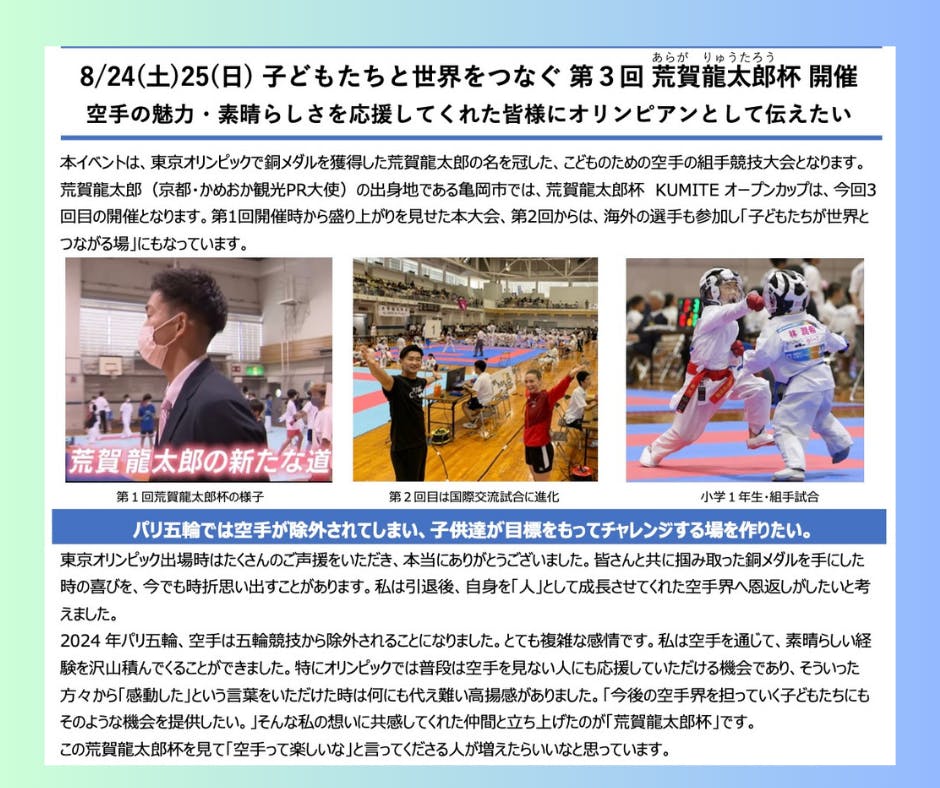 現在、「荒賀龍太郎カップ」の準備が順調に進んでおり、広報活動も積極的に行っております。亀岡市の市政記者クラブを通じて、京都新聞、朝日新聞、毎日新聞、読売新聞、産経新聞、京都放送、NHK京都、共同通信、時事通信の9社様 各メディアに大会の情報を取り上げていただき、広く報道や宣伝をしてもらうようお願いしております。画像は、そのニュースリリースの一部です。