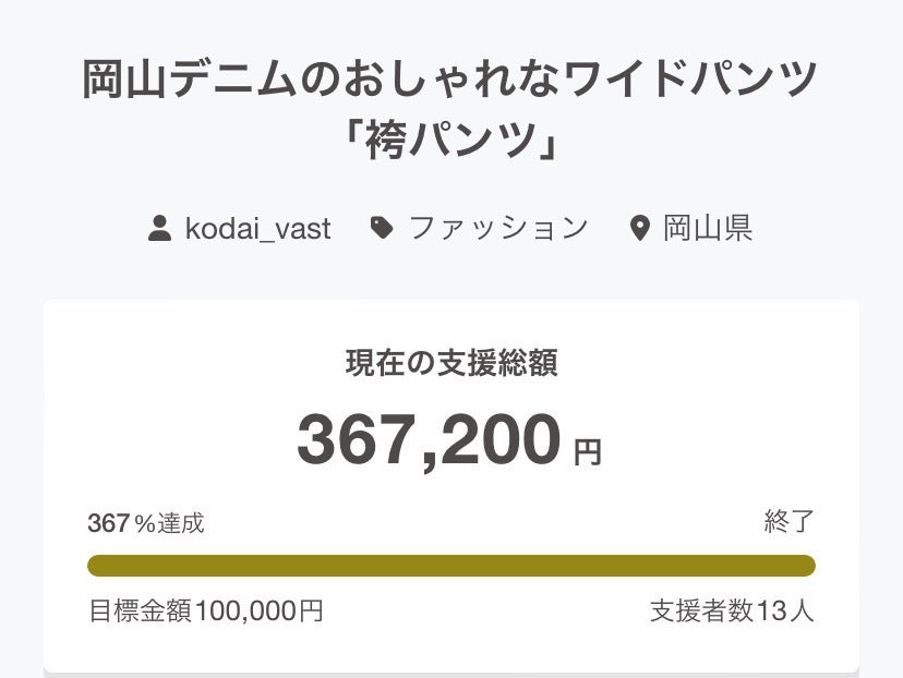 2024/09/04 13:15プロジェクト期間が終了いたしました。たくさんのご購入や応援のコメント本当にありがとうございます。結果は[支援者数:13人][支援総額:367,200円]目標367%達成となりました。本当に多くのご支援をいただき感謝でいっぱいです。これより商品発送の準備に入らせていただきます。皆さんの元へ袴パンツをお届けできると思うととても嬉しく、ワクワクする気持ちでいっぱいです。発送時にはまたこちらでお知らせいたします。今後も活動の方を発信していく予定ですので引き続きよろしくお願いいたします! もっと見る