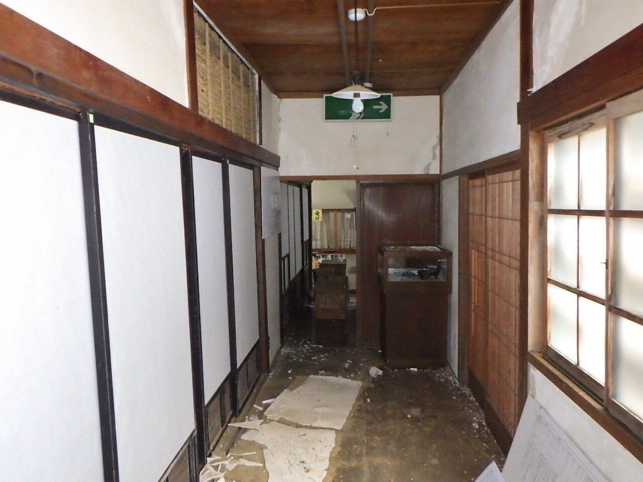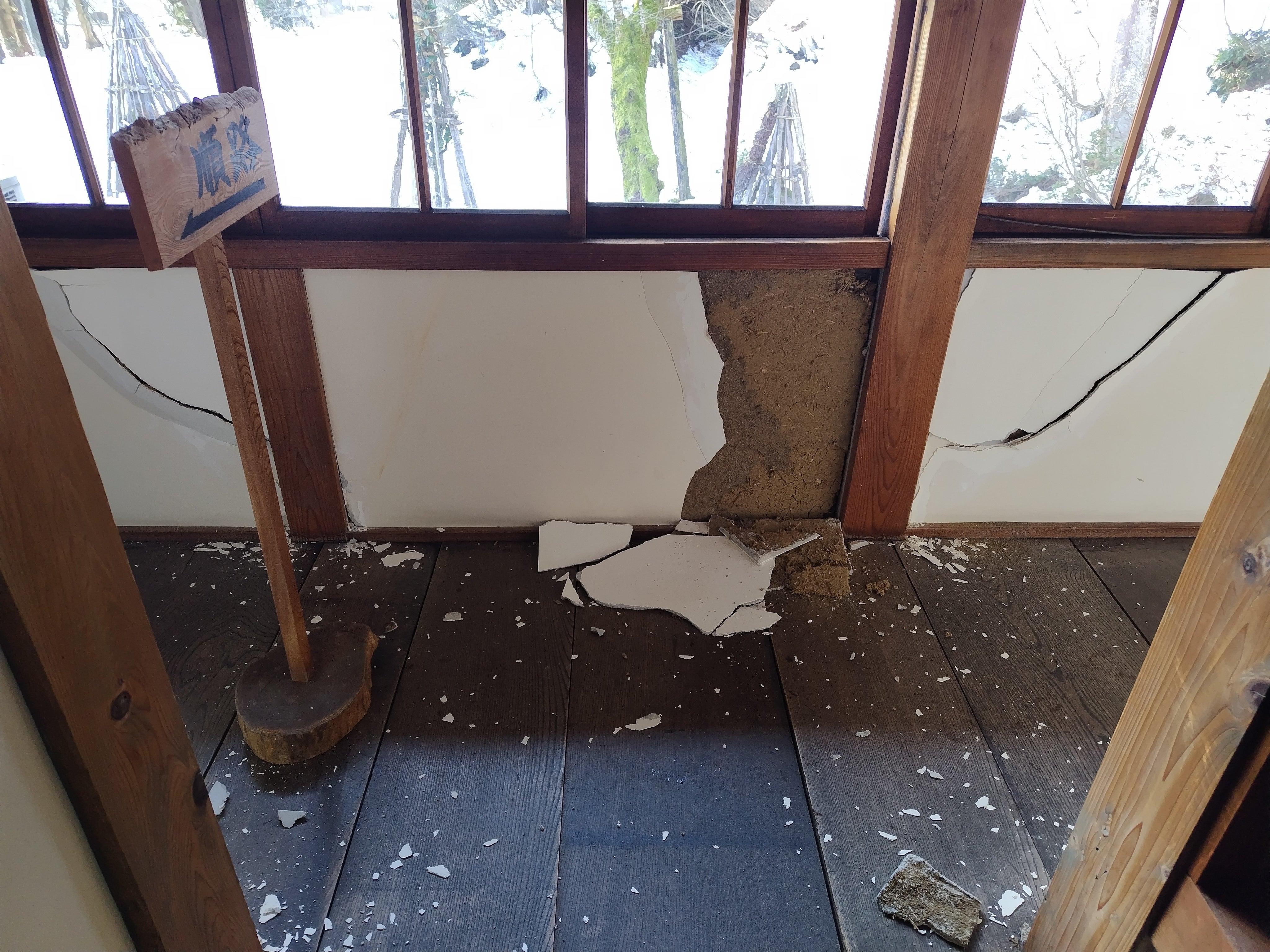 これまで、中越地震(2004)、中越沖地震(2007)、長野県北部地震(2011)に加え、豪雪など度重なる災害に見舞われてきましたが、その度に修復を続けなんとか公開を続けてきました。しかし今回の地震では、本館の内壁(漆喰壁)のすべての区画でひび割れ、崩れが生じ、屋根瓦がずれたり、表門の鬼板がずれるなど、これまでの大きな地震では経験したことがないほどの打撃を受け、大規模な修復工事なしには開館できない状況となり、総額1,300万円にのぼる修復費用がかかりました。