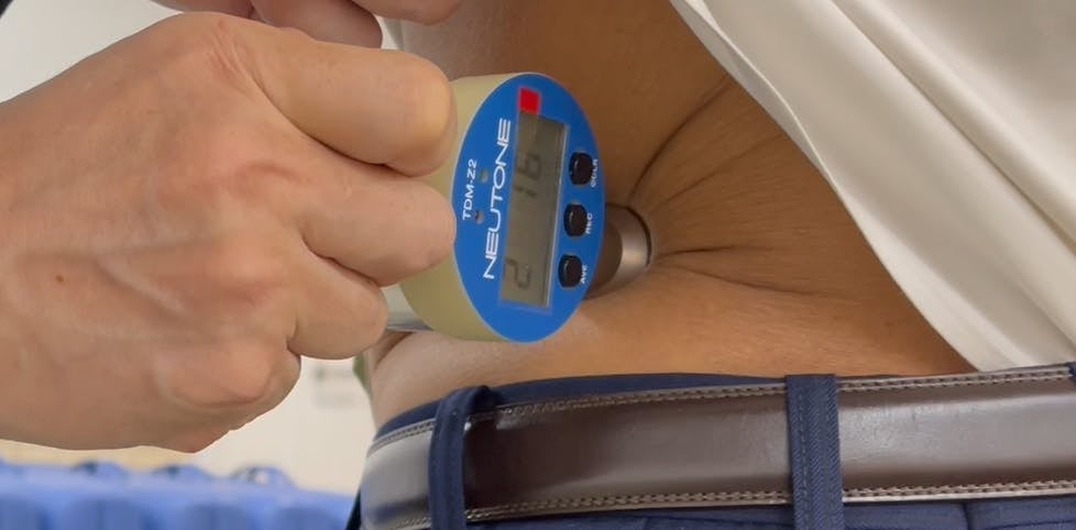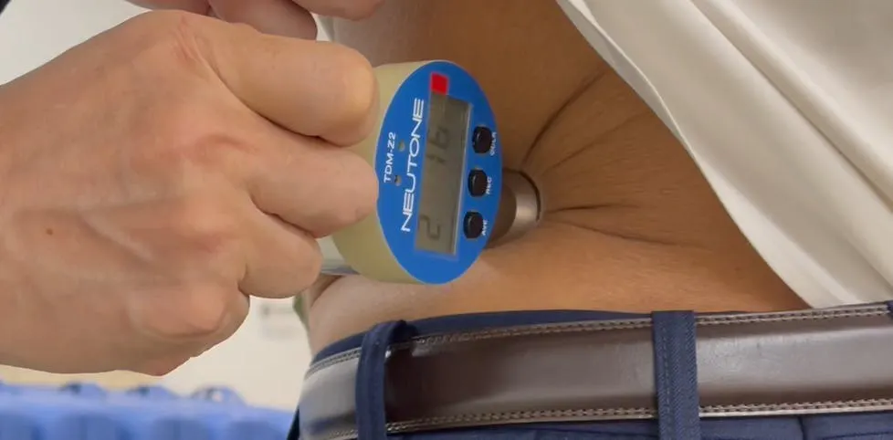 腰や肩の痛みを訴える患者さんの筋肉の硬さを筋硬度計で測定すると、50以上の数字を示すことも少なくありません。
