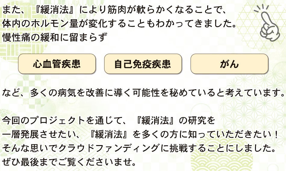 このプロジェクトを通じて、私たちは緩消法の科学的根拠を確立し、その有効性を世界中に示すことを目指しています。そして、研究成果を通じて、多くの人々が健康で充実した生活を送る手助けをしたいと考えています。クラウドファンディングを通じて、皆様のご支援をいただければ幸いです。この研究が成功し、多くの人々に貢献できることを心から願っています。