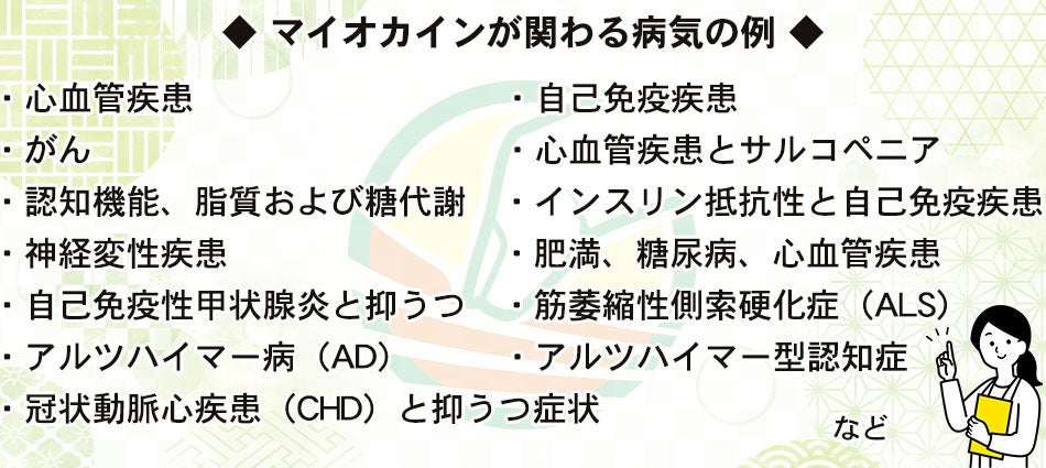 マイオカインは、運動や筋肉の活動に応じて体内で様々な健康効果をもたらすことが知られており、 特に代謝の向上、炎症の抑制、免疫機能の強化など、多岐にわたる健康効果が報告されています。