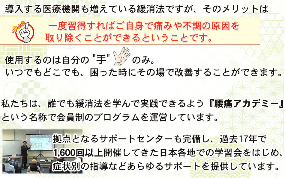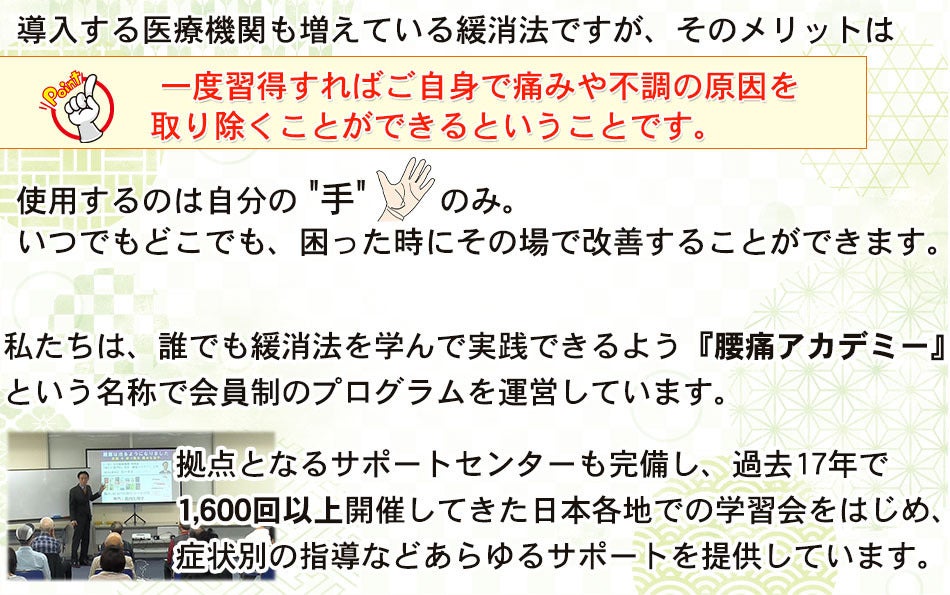 私は『緩消法』研究をつづける傍ら、患者さんが自分自身で痛みや不調を改善してもらうためのコミュニティ『腰痛アカデミー』を運営しており、 累計1万7,000人以上の方の慢性痛のケアをサポートしてきました。