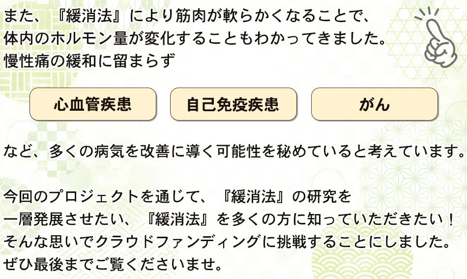 今回の研究は、これまでの緩消法研究に比しても巨額な費用が必要となりますが、 緩消法の有効性を医学的に立証し、筋肉の緊張緩和がもたらす健康効果を広く認知させるためには欠かせないものです。
