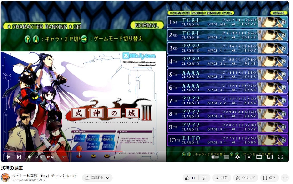 表題の件ですが、ゲームセンター秋葉原「Hey」店様のチャンネルで「式神の城III」ライブ配信が開始されました。