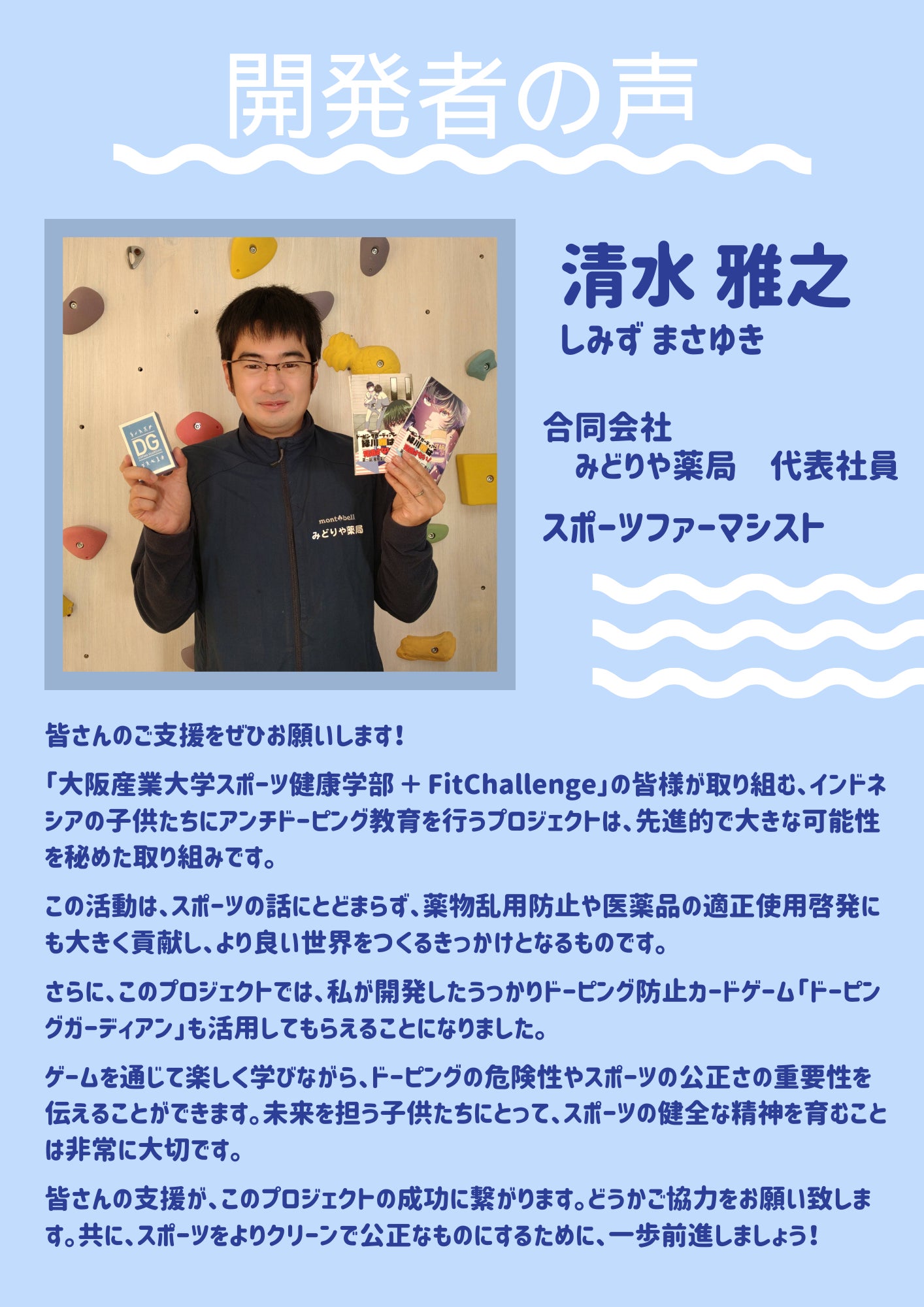 このカードゲームを使えば、日本人の私達でも子ども達に対して、アンチドーピングや健康に関する知識を身に付けさせるための楽しい授業を実施することができるし、その授業の様子を見た現地の先生達もきっと すぐに同じような授業ができるようになると思うんです!