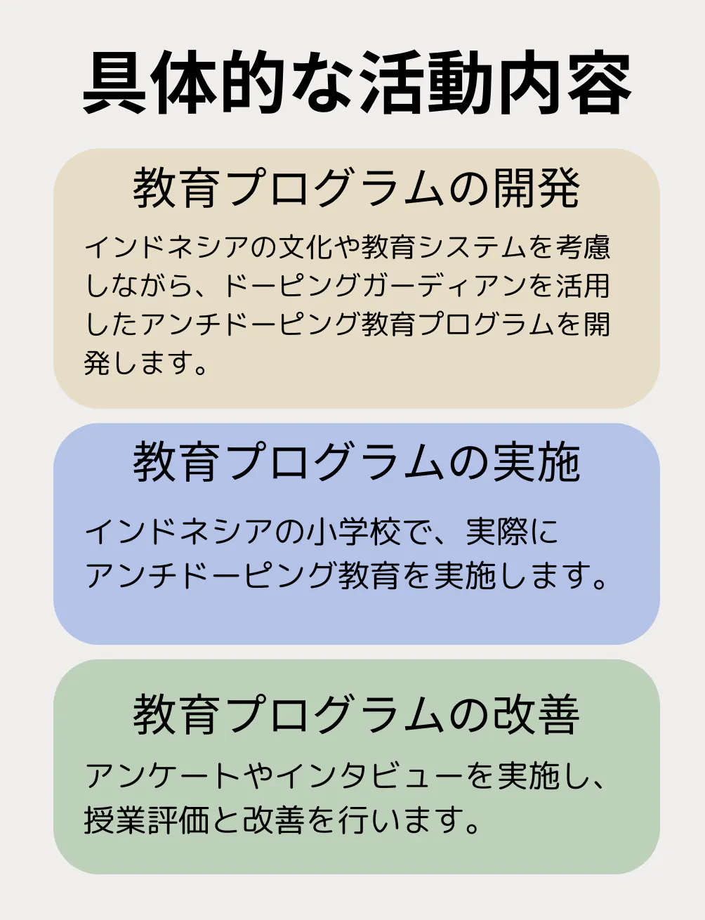 このプロジェクトでは、インドネシアの小学校で子ども達が楽しみながら学べるアンチドーピングの授業を実施し、子ども達のスポーツマンシップや健康意識を高めるきっかけを作りたいと考えています。