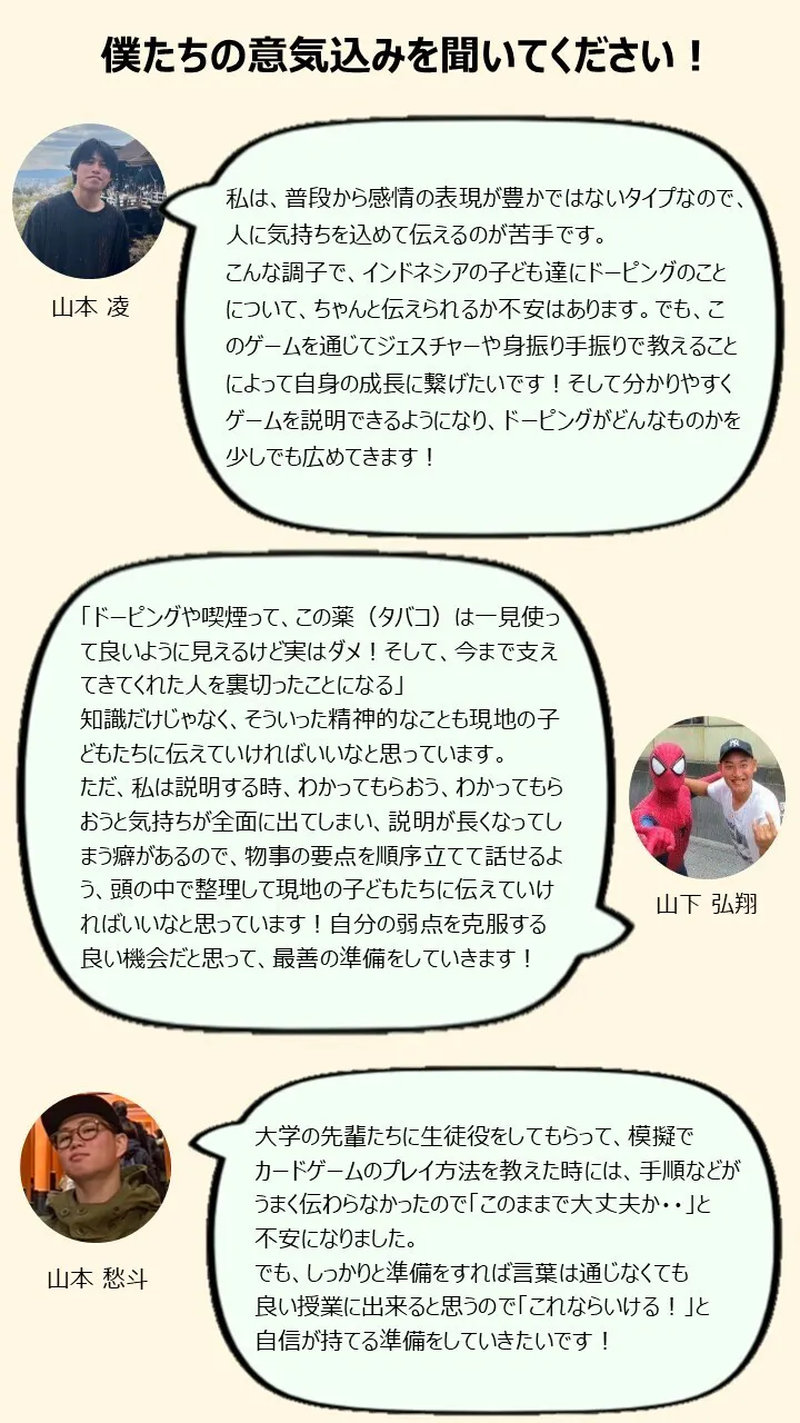 山下弘翔(真ん中)このプロジェクトを通じて、インドネシアの子どもたちがどんな教育を受けているのか?を知りたい!そして、大学で学んできた知識や技術を使って、インドネシアの子どもたちにスポーツや健康のすばらしさを伝えたいです!