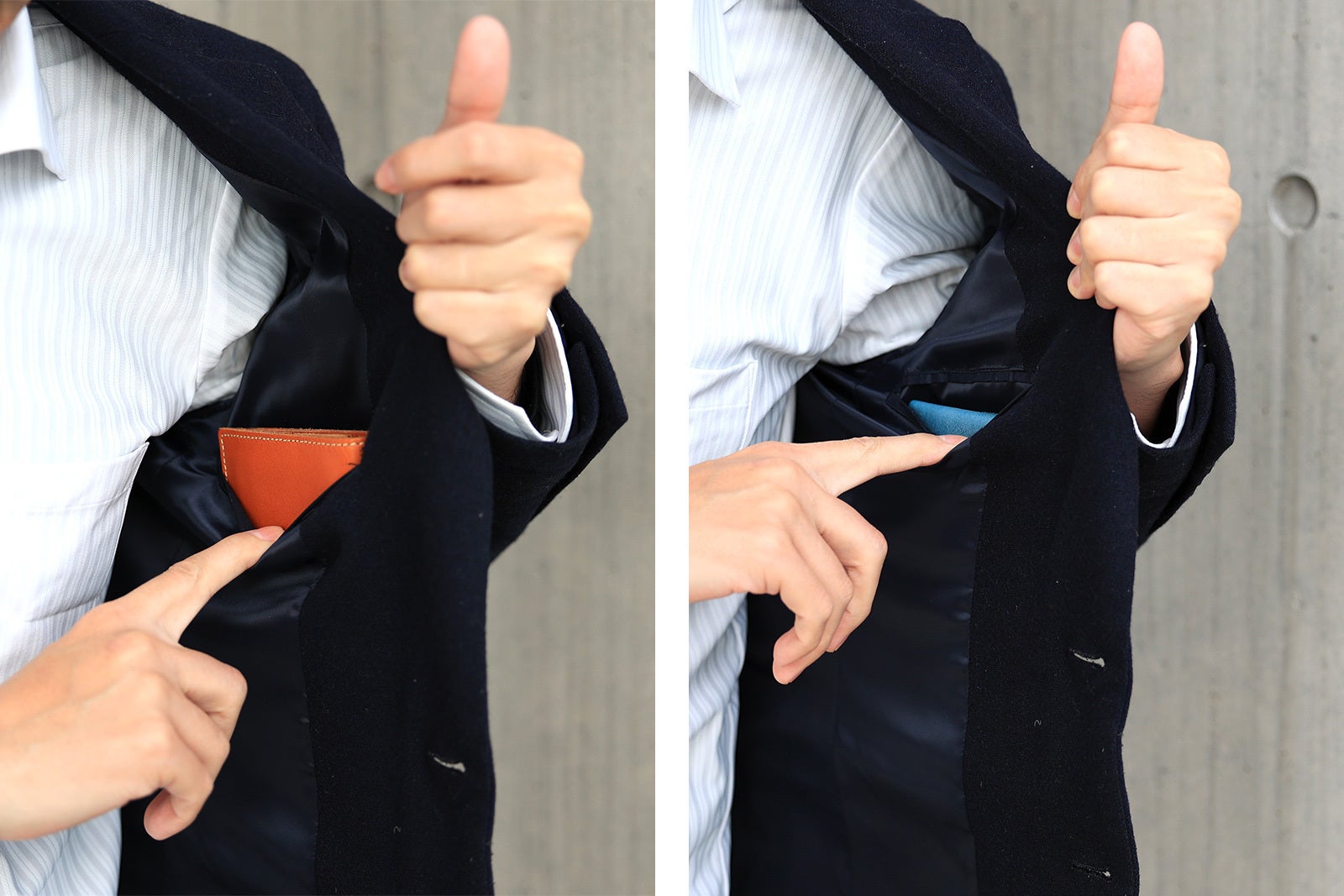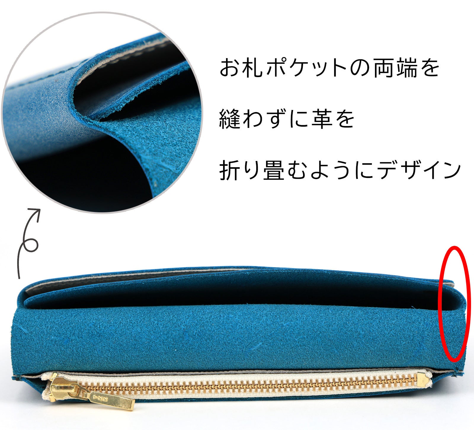 右面のポケットの革の重なりを「4枚→3枚」に変更し、ステッチをかけて膨らみを押さえることで、スリム化に成功しています。