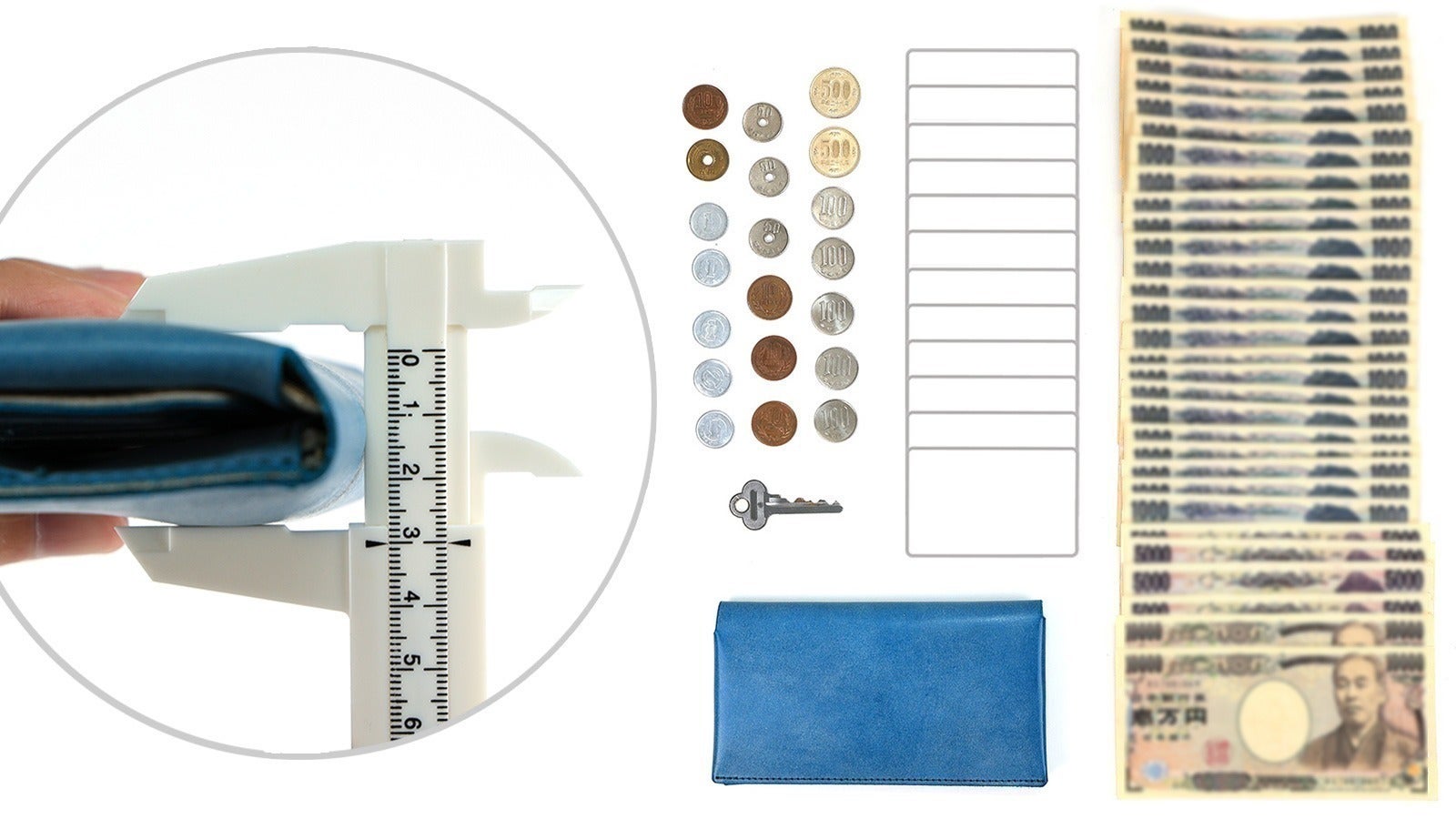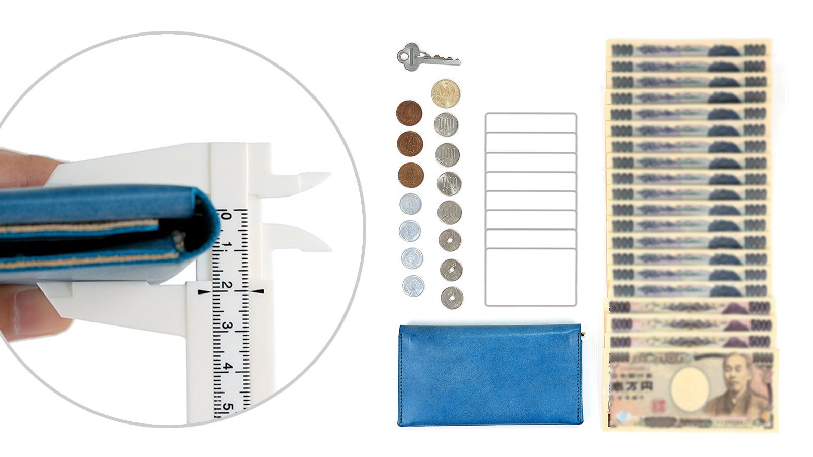 カード12枚(スリット左6枚 / 切込み2枚 / フリースペース左右各2枚)小銭20枚 / お札30枚 / 鍵1本