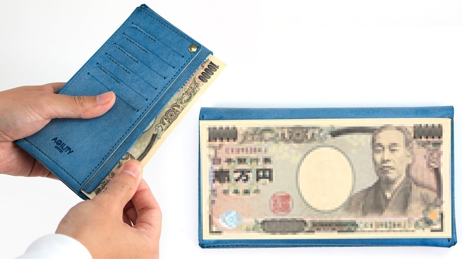 ※AGILITYサンプル長財布との比較、それぞれカード8枚・小銭15枚・お札20枚の収納。