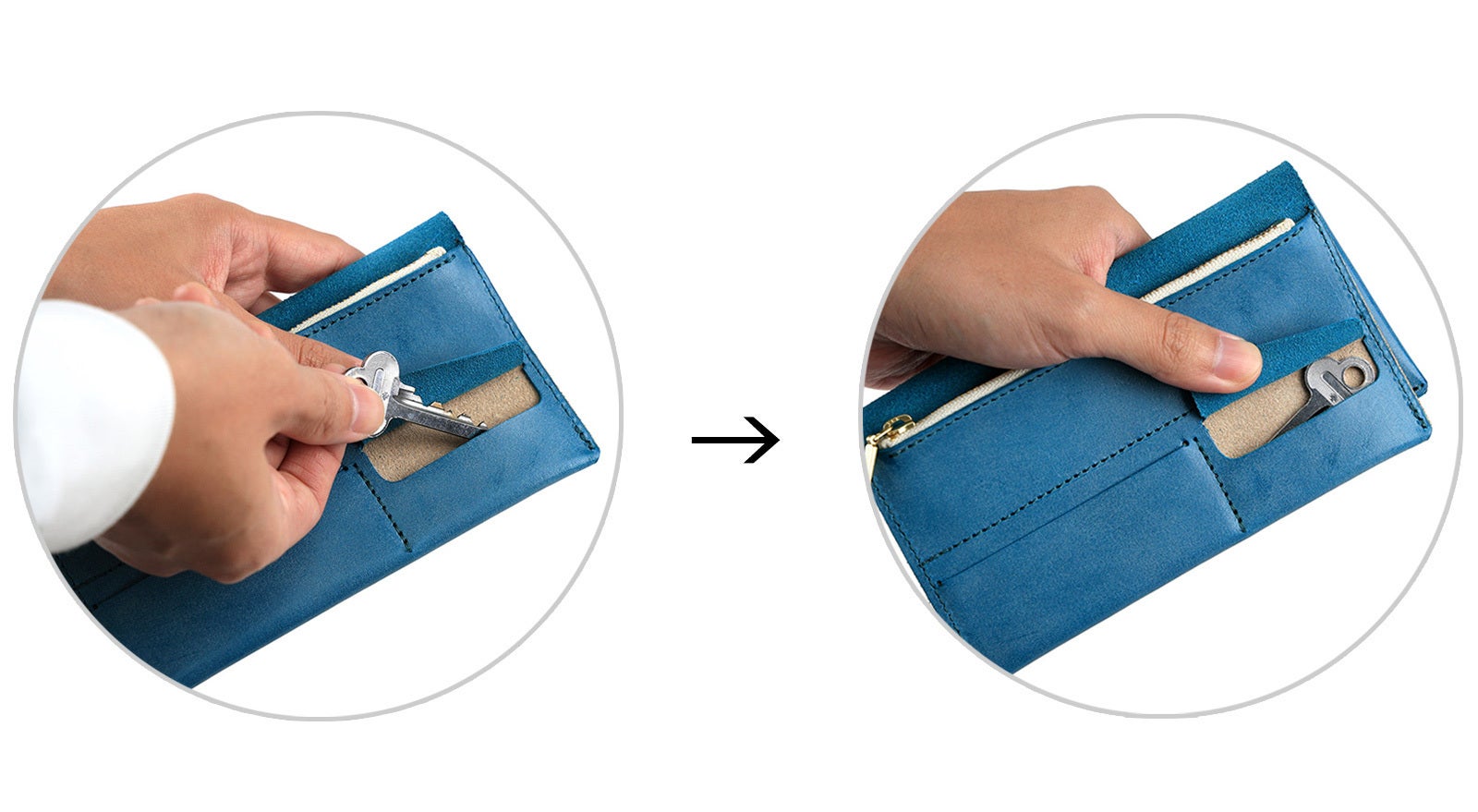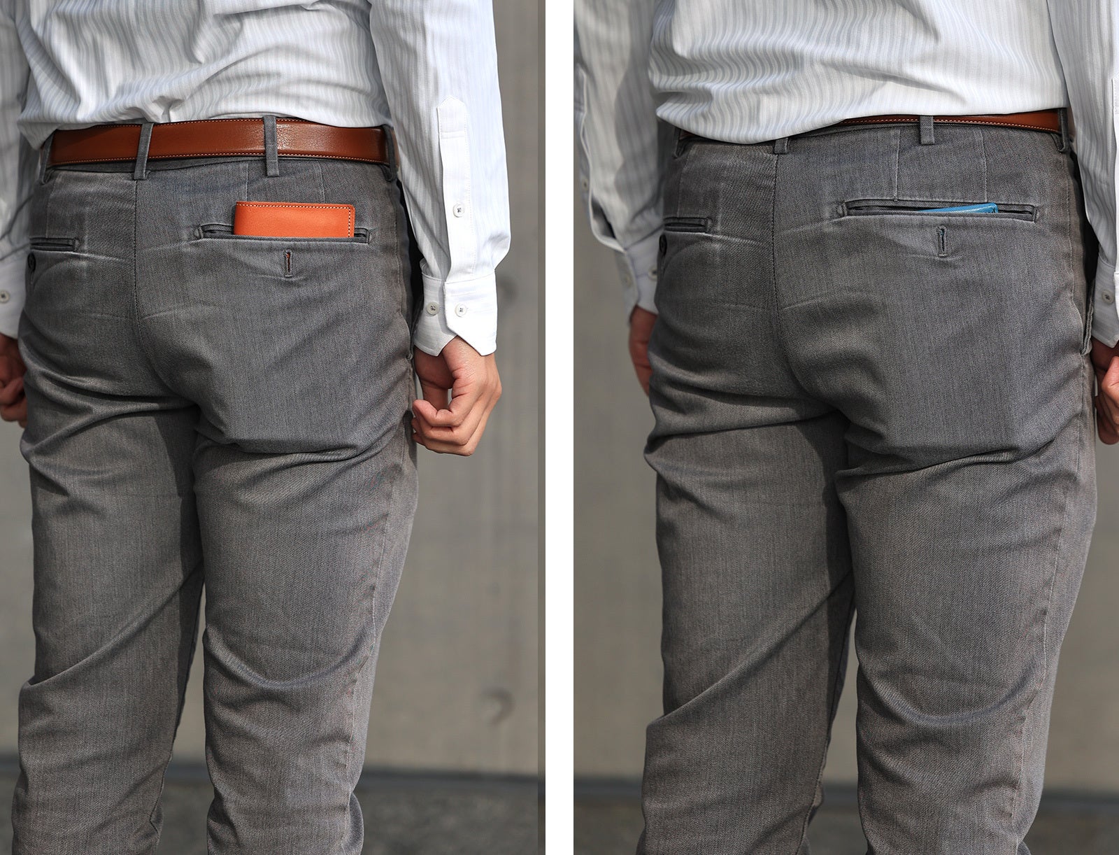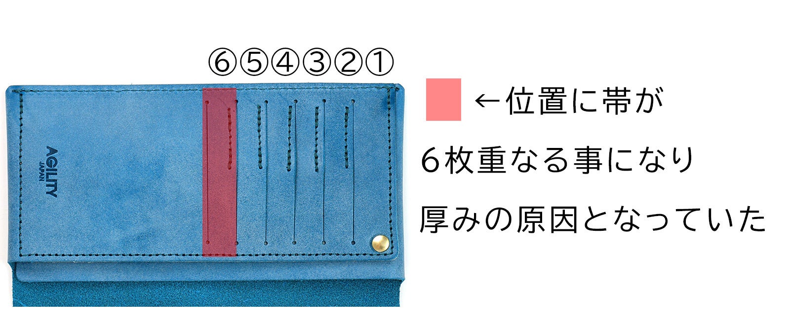 右面のポケットの革の重なりを「4枚→3枚」に変更し、ステッチをかけて膨らみを押さえることで、スリム化に成功しています。