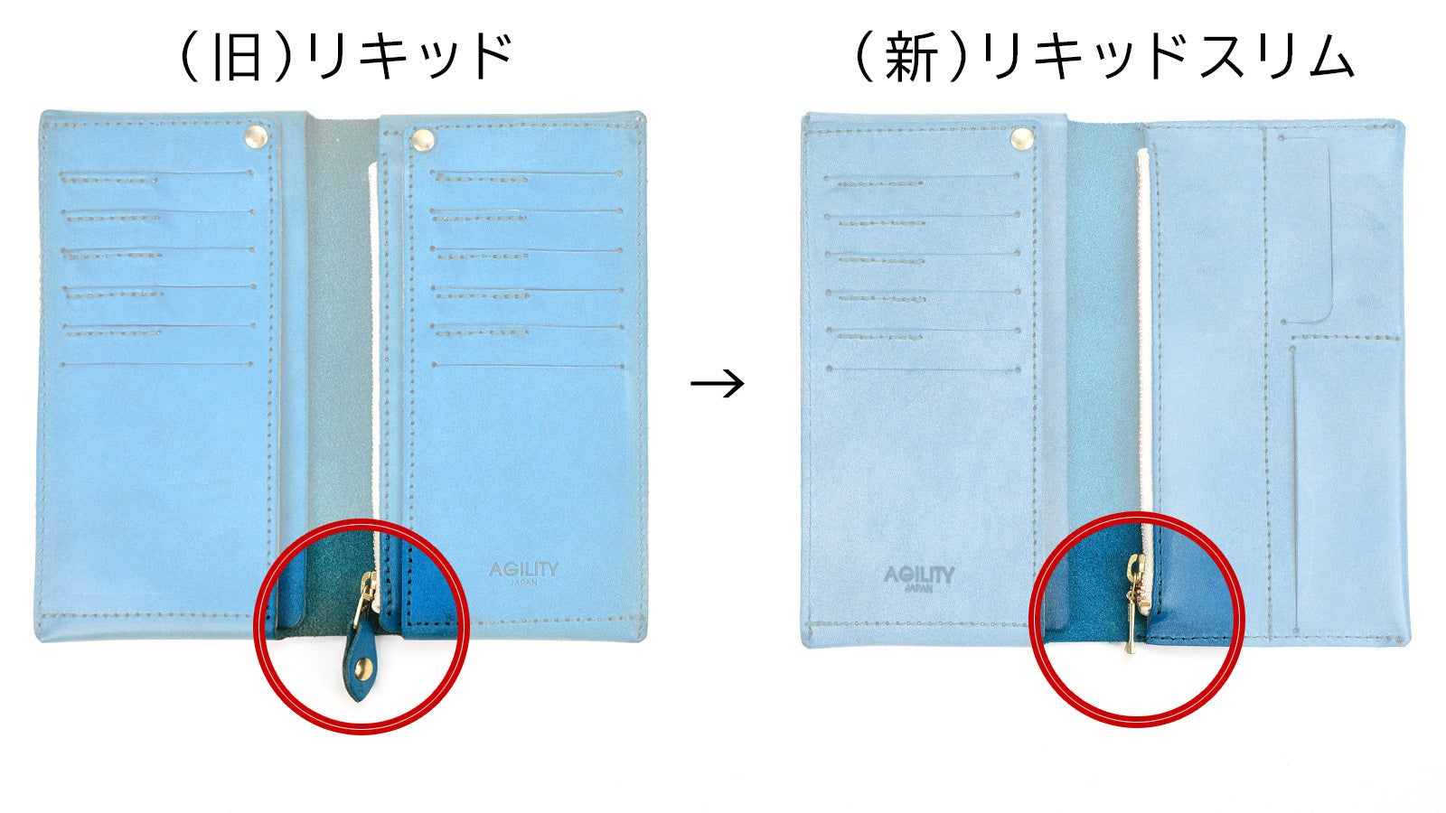 「リキッドスリム」はAGILITYの人気コンパクト長財布「リキッド」を現代の支払い事情に合わせさらに薄く・軽量にした長財布です。