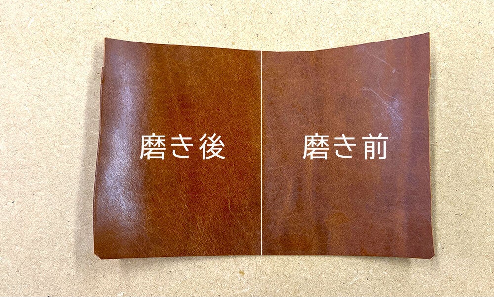 染料とオイル、ワックスをたっぷりと革の芯まで染み込ませ、さらに表面にもワックス仕上げをすることで、使用していくと摩擦により宝石のような艶が生まれます。
