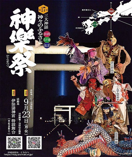 日本創生の物語を伝える「国生み創生神楽」、日向神話を伝える「高千穂夜神楽」、出雲神話を伝える「出雲神楽」を毎年招待しまして、本場の神楽を、淡路國一宮と称えられる日本最古の宮「伊弉諾神宮」で共演奉納される“神々のふるさと”『 三大神話神楽祭 』も、第17回を迎える運びとなりました。