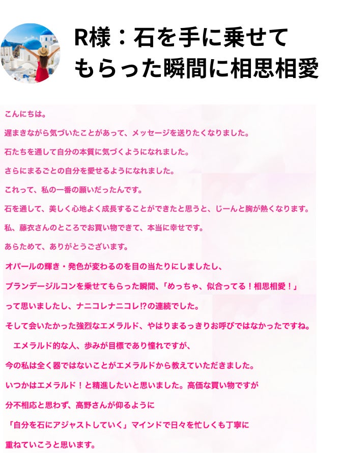 私は宝石で人生を変えたうちの1人でありますが、最初、ジュエリーを身につけて起きた変化をお客様から伺った時には、