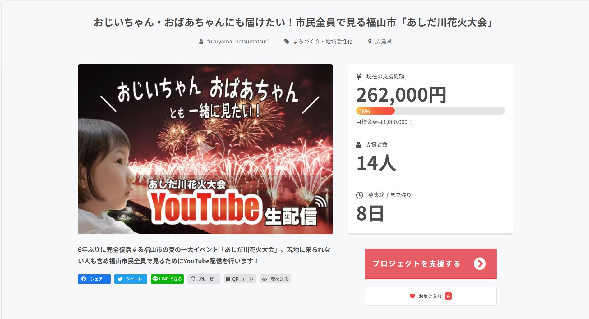 皆様のご協力のもと、どうにか配信の実現に漕ぎ着きたいと思っています。福山市全体でこの花火の輝き、わくわくを分かち合える日にしましょう!