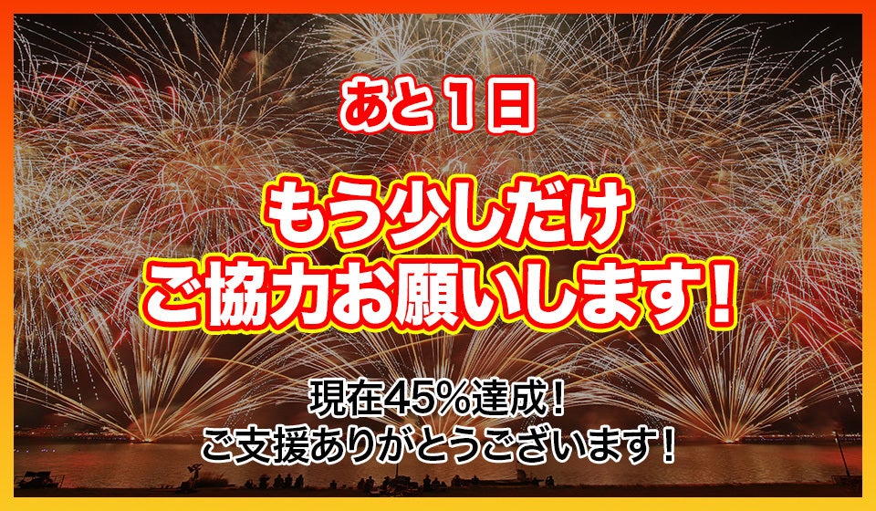 2024/08/12 11:15皆さまのおかげで約45%まで達成することができました!温かいご支援、本当にありがとうございます。スタッフ一同毎日感動しております。さて、あしだ川花火大会YouTube無料生配信を実現させるには、今のままでは赤字になってしまいます。。。終了まであと1日です。もう少しだけ、もう少しだけで良いので皆さまのご支援を頂ければとてもありがたいです!どうかよろしくお願いします!! もっと見る