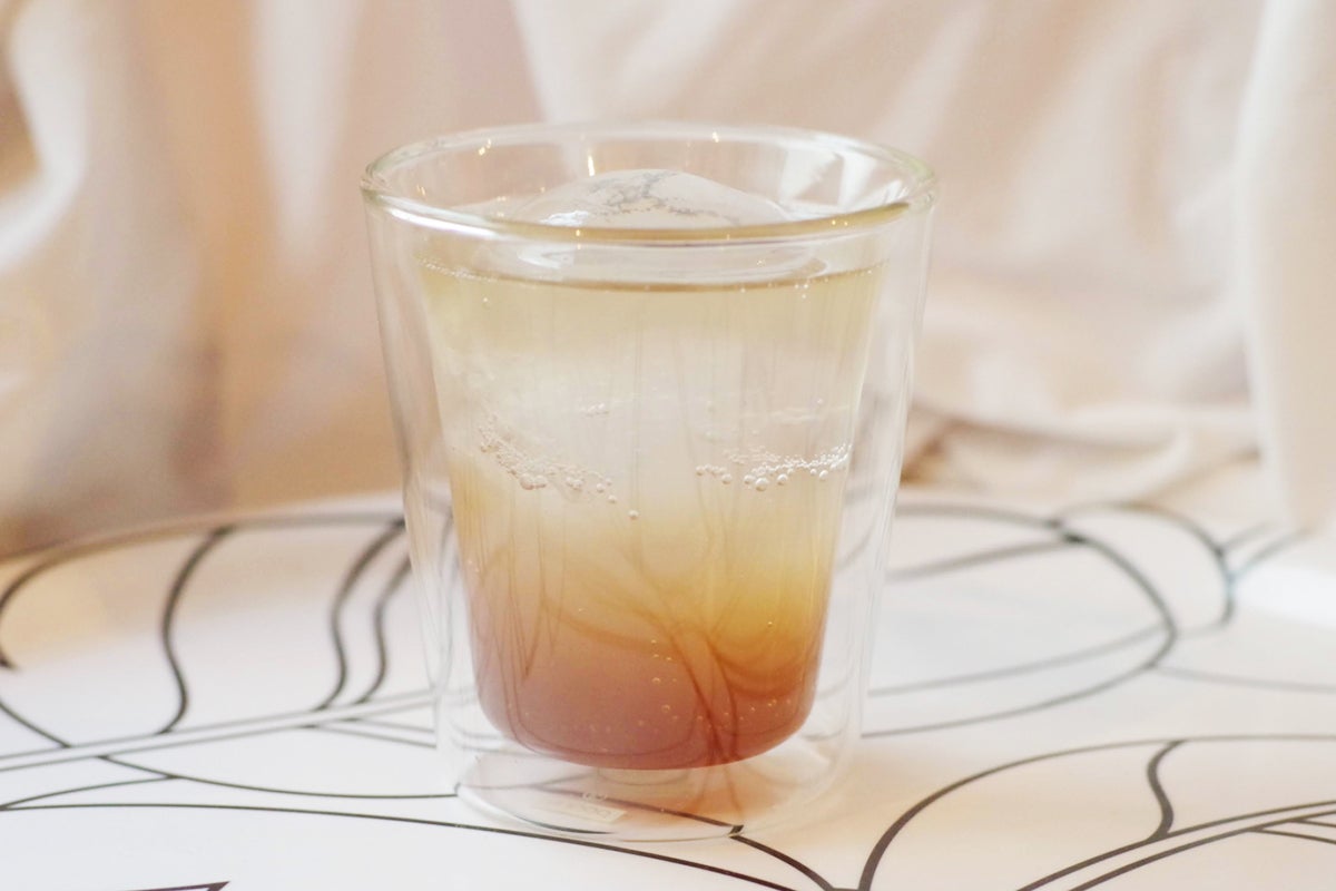 2層に分かれたシロップと炭酸水をゆっくりを混ぜてお召し上がりください