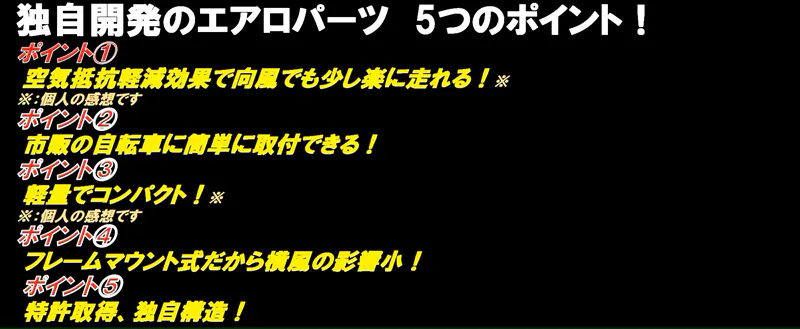 私事ですが、年齢による体力低下を少しでも補うため、自転車用の空力パーツと呼ばれる機材を試してみましたが、あまり効果が感じられませんでした。 このため、もっと効果的な機材はないかと模索した結果、フェアリングが空気抵抗軽減に有効との結論に至りました。その後、独自にフェアリングの研究、改良を重ねた結果、ようやく空気抵抗軽減効果と軽量コンパクトを両立した製品が完成しました。この製品を日本国内だけでなく海外の自転車好きの方々にも知ってもらい、新たな自転車の楽しみ方を広めたいと考え、このプロジェクトをスタートしました。