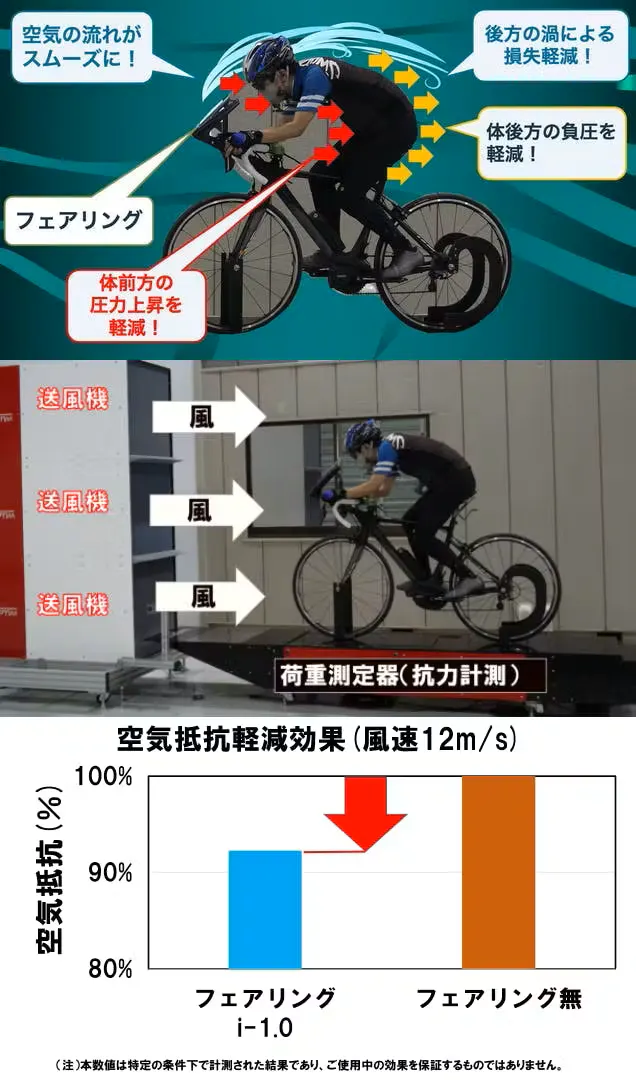 A:空気抵抗の軽減効果はご使用条件(風向き、自転車の速度、他)で変わりますが、外部の風洞試験設備で行った実験では、風速12m/sで約7%の軽減効果が確認されています。(風速12m/sは、秒速5mの向かい風の中を時速25kmで走行したものと同様の条件になります。) 風洞試験設備での試験の模様はYOUTUBEで公開していますのでご参照ください。