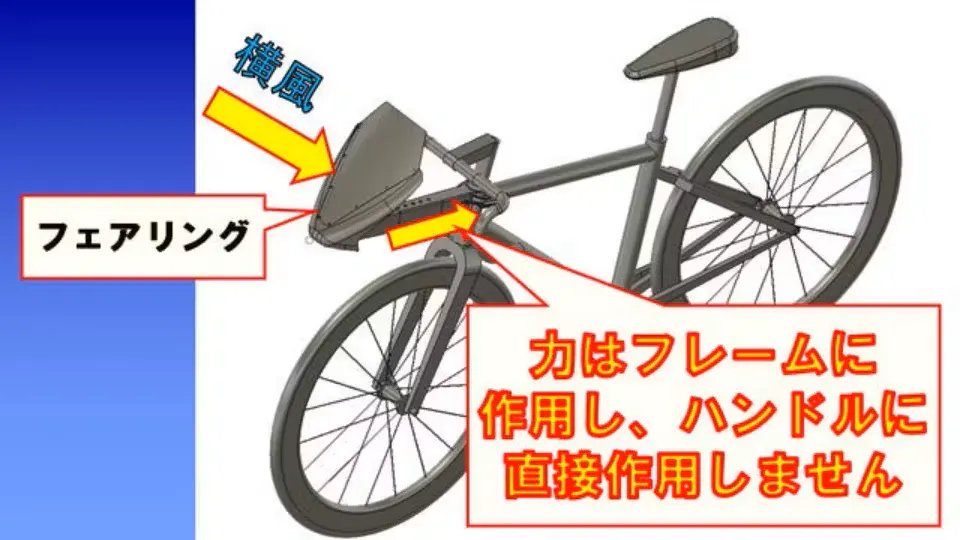 A:モデルi-1.0はフレームマウント式を採用していますので、横風による外力は直接ハンドルには作用せずフレームに伝わりますので、横風の影響は軽減される構造となっています。また、モデルi-シリーズは、横風の作用面になる側面投影面積も最小にして影響をさらに軽減しています。詳細については、「自転車用フェアリング(model : i ) 横風対策を解説!」のビデオをYOUTUBEで公開していますのでご確認下さい。