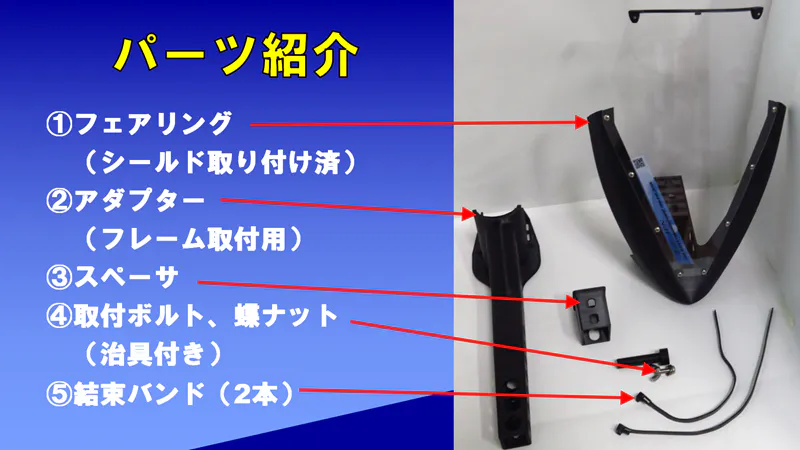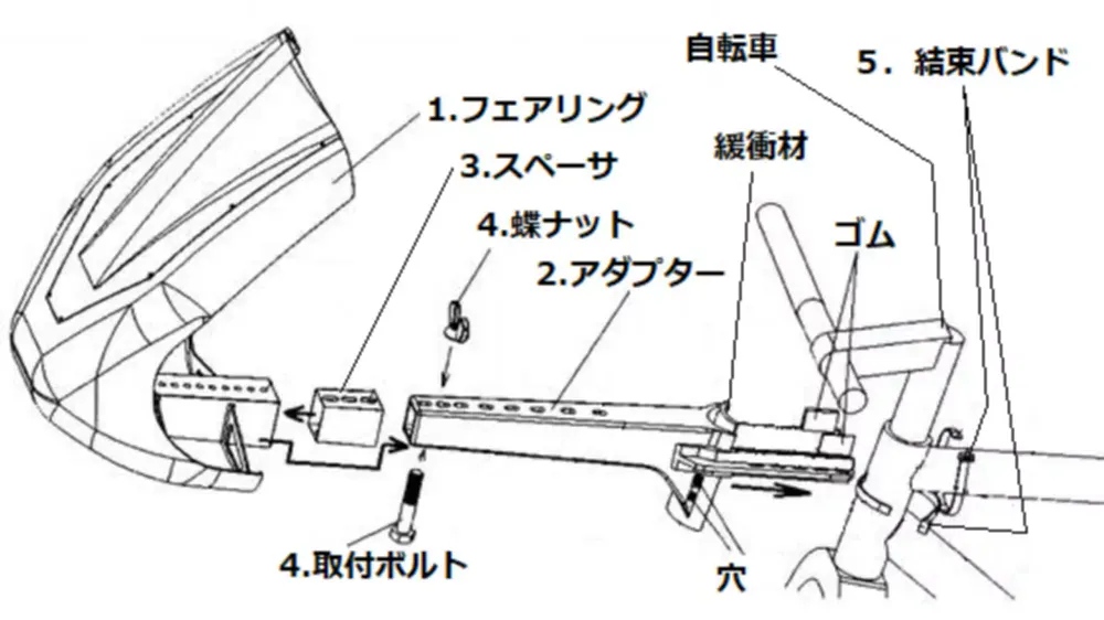 (注)・取り付けられないタイプの自転車もあります。詳細は仕様をご確認ください。・事前にフェアリングにシールドの組付け、アダプターに緩衝材、ゴムの接着等が必要です。詳細は組立要領書、取扱説明書をご参照ください。
