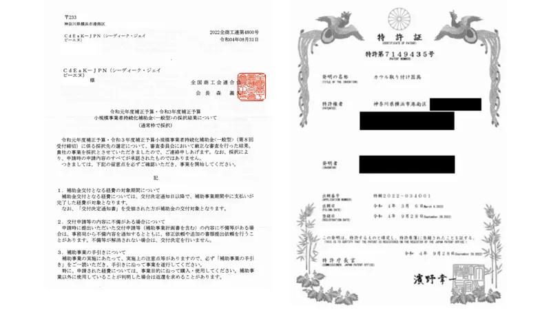 小規模事業者補助事業採択通知 特許証