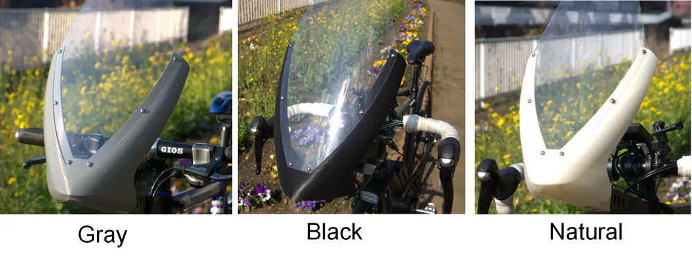 ◆色: フェアリング部:黒、グレー、ナチュラル(乳白色) (3種類選択可) 風防:透明 アダプター、バンド類他:黒(1種類) ネジ類:金属色(1種類)