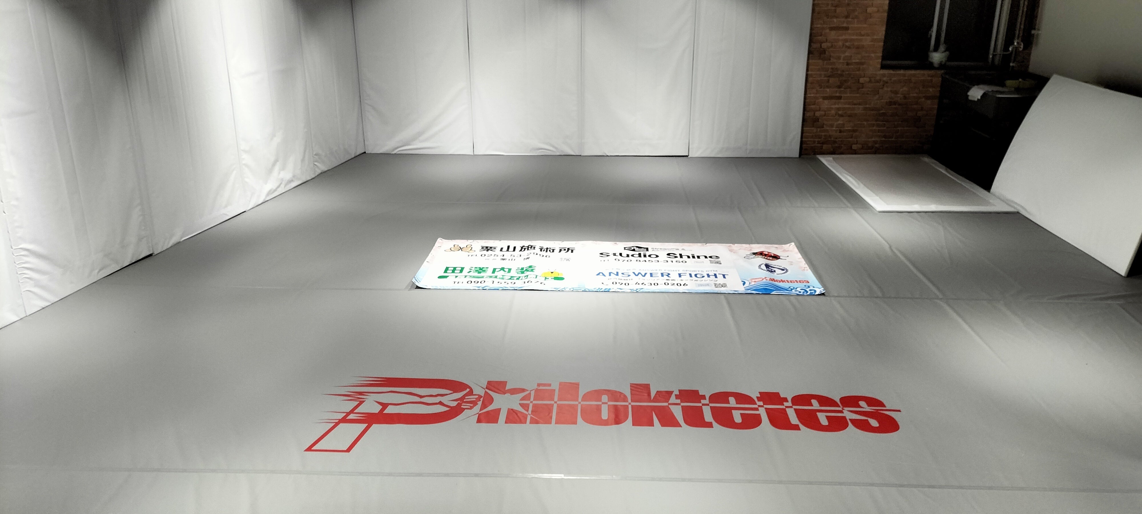 ジムの練習場スペースに掲げるバナーにロゴを掲載します。格闘技ジムはただの運動施設ではなくコミュニティだと思っております。バナーにロゴを掲載することでコミュニティに信頼され、愛され、格闘技を通したあたたかい繋がりができると信じております。[↓↓赤で囲いました。このような感じです、バナーはこちらで作成します。]