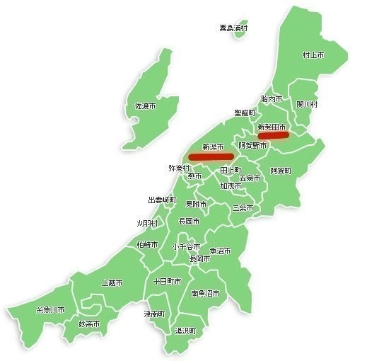 新発田市は越後平野(新潟平野)の北部に位置し、県都新潟市に隣接する新潟県北部の都市です。北西には美しい海岸が広がり、南東の山岳地帯には豊かな自然景観に恵まれた所です。